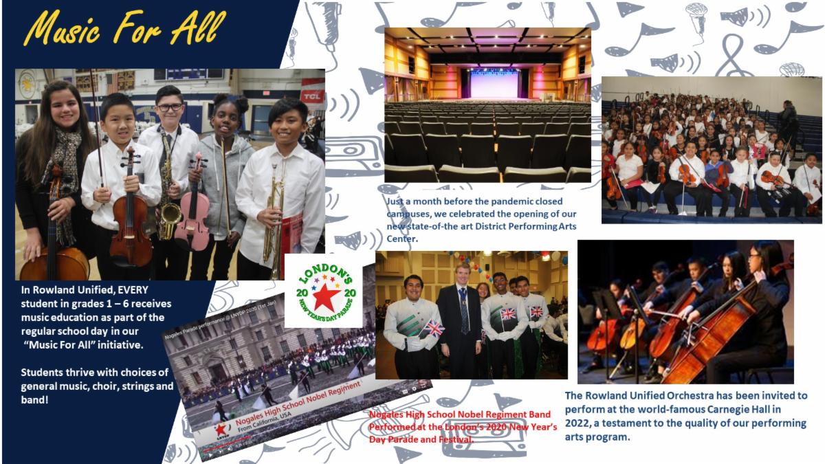 Continuing its focus on access, equity and excellence, Rowland Unified launched its Music for All program in 2016, which continues to grow and flourish, and continued even during remote learning. Understanding that music education supports academic success and a creative outlet for many students, every student starting in first grade, receives music education taught by a credentialed music teacher once per week throughout elementary school. Additional weekly lessons are also provided after school at no cost to the family. As students enter middle and high school, they are able to continue their music interests in individualized classes for choir, band, guitar, mariachi, orchestra or jazz band. Students have performed in the Macy’s Day Parade and London's New Year’s Day Parade and most recently, students have been invited to play in 2022 at Carnegie Hall.