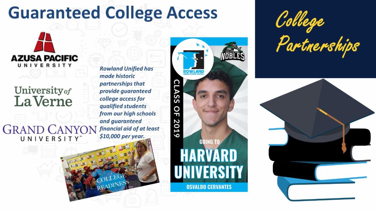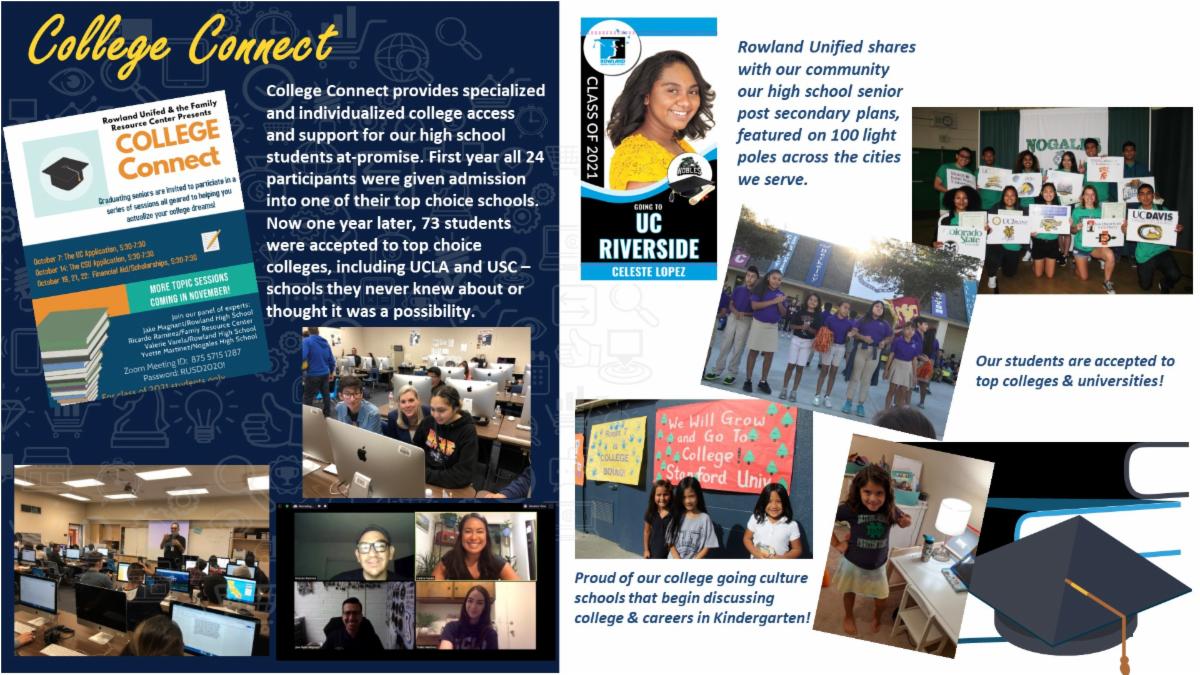 Examples of Rowland USD’s innovation can be seen below with the integration of educational technology and bringing educational equity through digital access, (VIDEO LINK), and specific programs such as Kinder Care and Connect, Music for All and College Connect (VIDEO LINK).