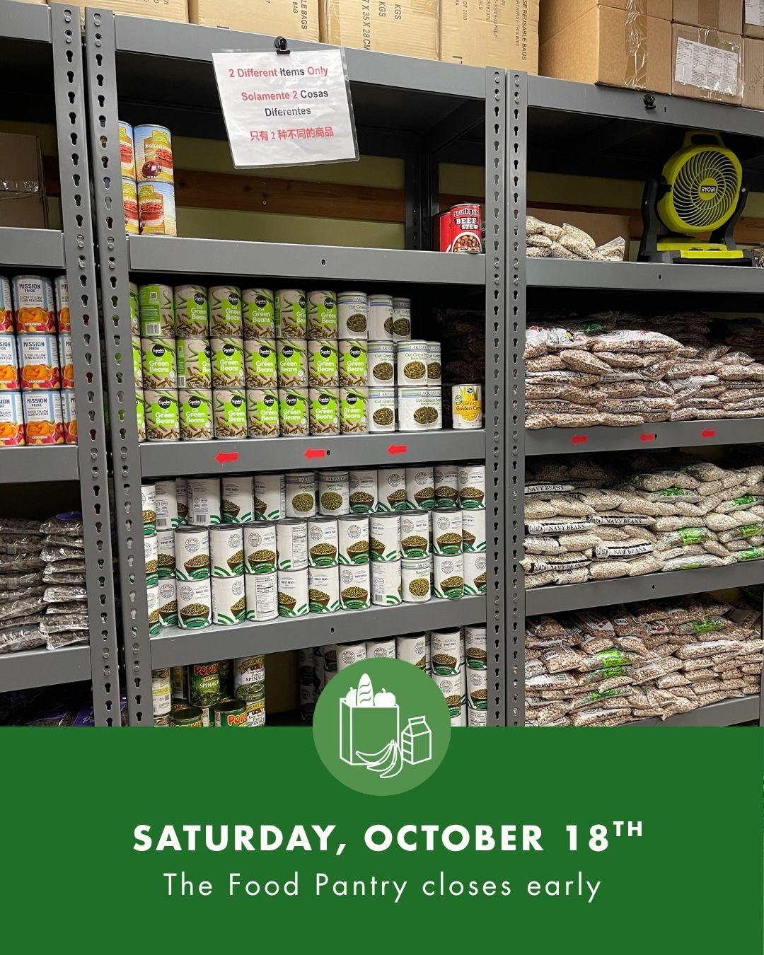| | We can only operate with your help! | | | | The Food Pantry will close early tomorrow, Saturday, October 18th | |