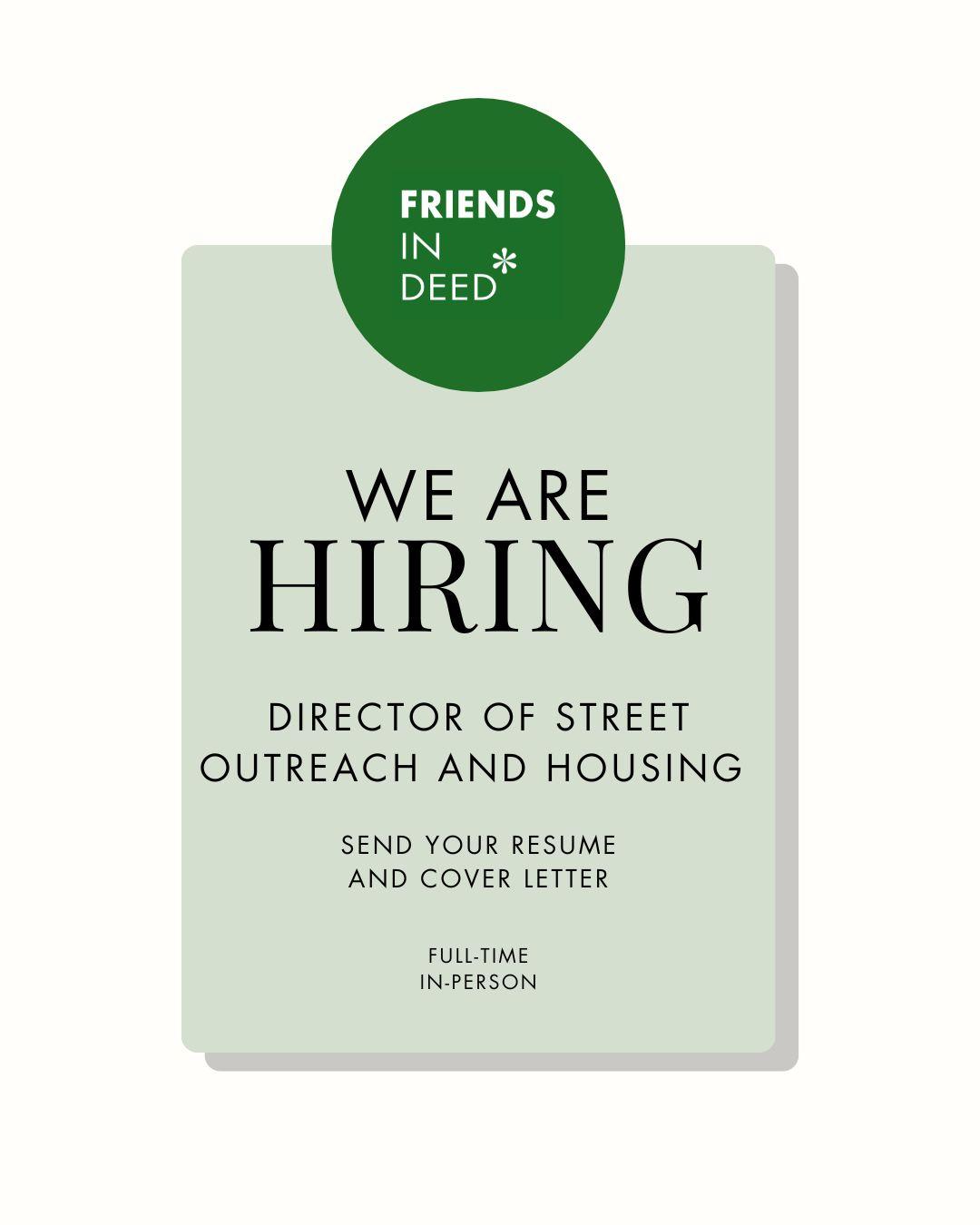 Friends In Deed is seeking a Director of Street Outreach & Housing to lead our dedicated team serving neighbors experiencing homelessness.