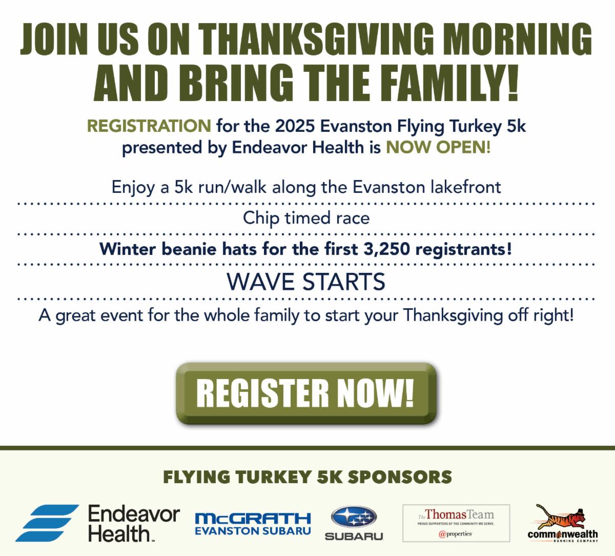 Runners must cross the finish line before The Turkey to receive a button. Chip times do not count. Our Official Turkey will carry a sign indicating it is him, so you don't get him confused with any other runners that might be dressed up and on course. (He will run the race somewhere around 21 minutes, so get your fastest shoes on.) The Turkey will start in the first wave.