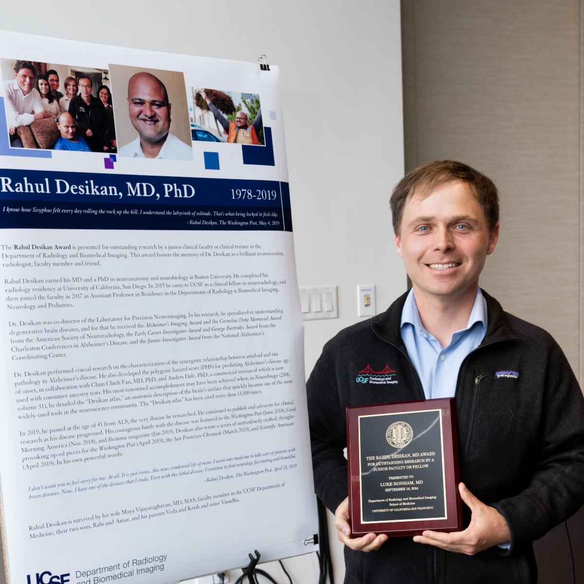 Luke Bonham, MD, received the Rahul Desikan Award for his innovative and comprehensive work using radiogenomics to understand neurobiology. Bonham’s research is focused on improving the diagnosis and treatment of neurodegenerative diseases, and he is also a T32 fellow and RSNA resident research grant awardee. | | |