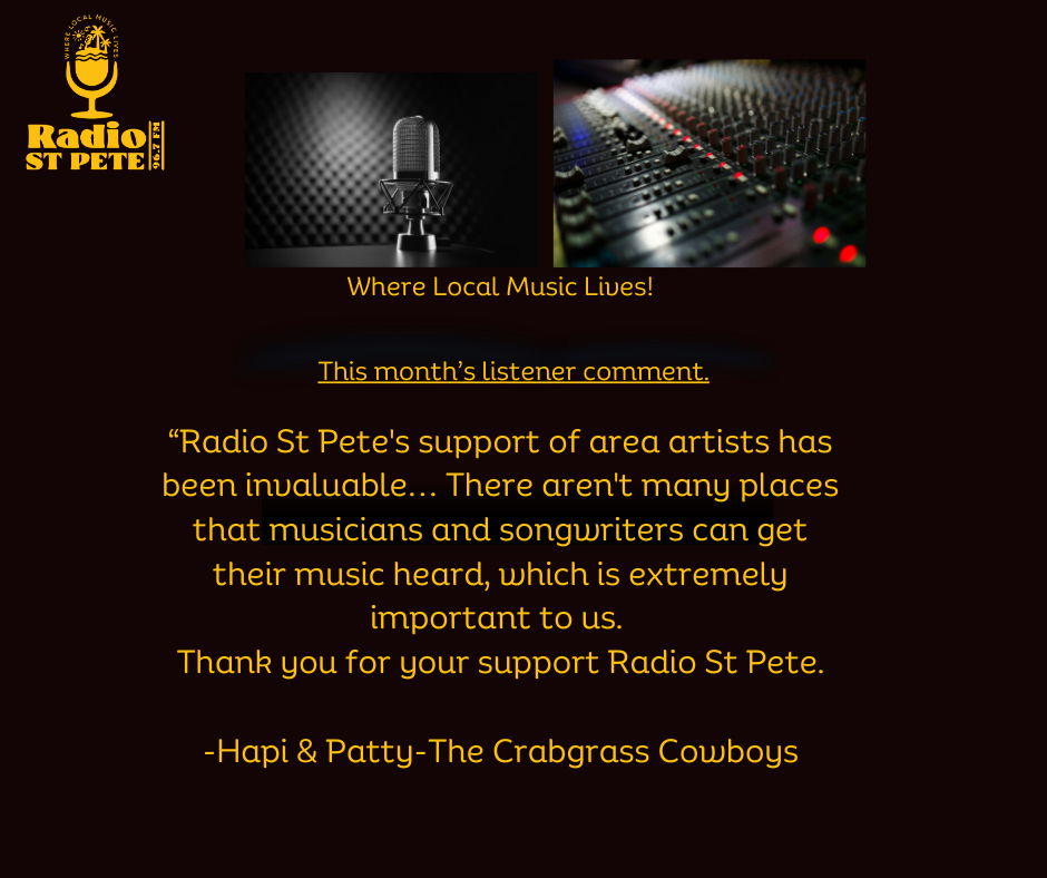 | Send your listener comments to info@radiostpete.com. You could be a featured listener next month on our social media and in the newsletter. | | | |