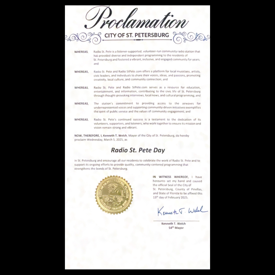 In recognition of its contributions to the local community, Radio St. Pete was honored with a proclamation from the City of St. Petersburg, officially declaring March 5, 2025, as “Radio St. Pete Day.” You can listen to the proclamation as read by Mayor Kenneth Welch at the link below. The proclamation was presented during the city council meeting on February 13, 2025. It commemorates the station’s first anniversary at its new studio at Thrive DTSP, marking a significant milestone in its mission to promote local music, culture, and community engagement. Radio St. Pete is honored by this recognition highlighting the stations positive impact on the local arts and media landscape.