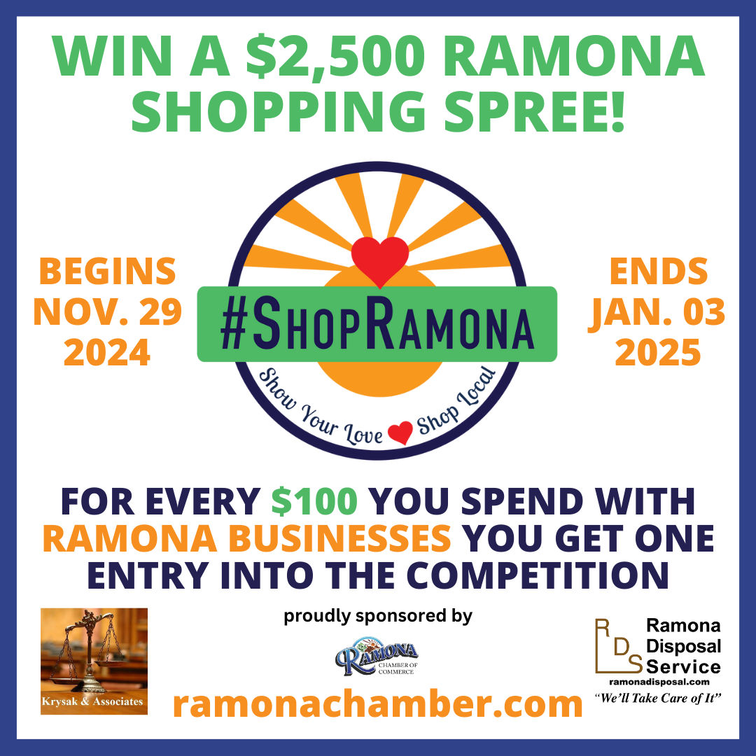 The Ramona Chamber of Commerce is excited to announce the return of the $2,500 Ramona Shopping Spree! Local residents can earn one entry into the drawing for every $100 spent at Ramona businesses or services (zip code 92065) between Friday, November 29th, and Friday, January 3rd, 2025. All receipts must be submitted to the Chamber with your name and phone number by 3:00 p.m. on January 3, 2025, to qualify. The winner will be drawn on Wednesday, January 8th at noon during our Facebook Live with the Chamber. If you need the receipts back, please make a note then pick them up between Jan 9-31, 2025. |