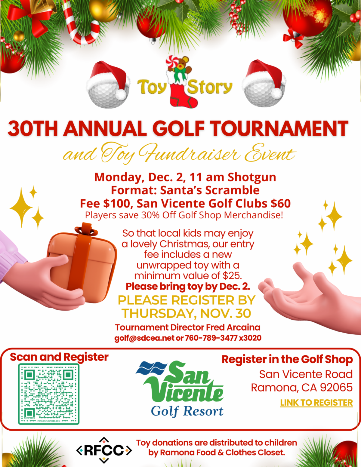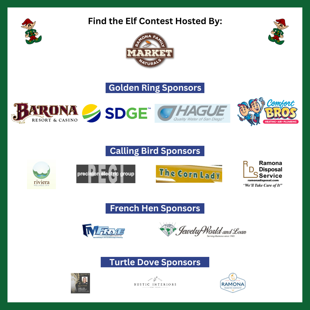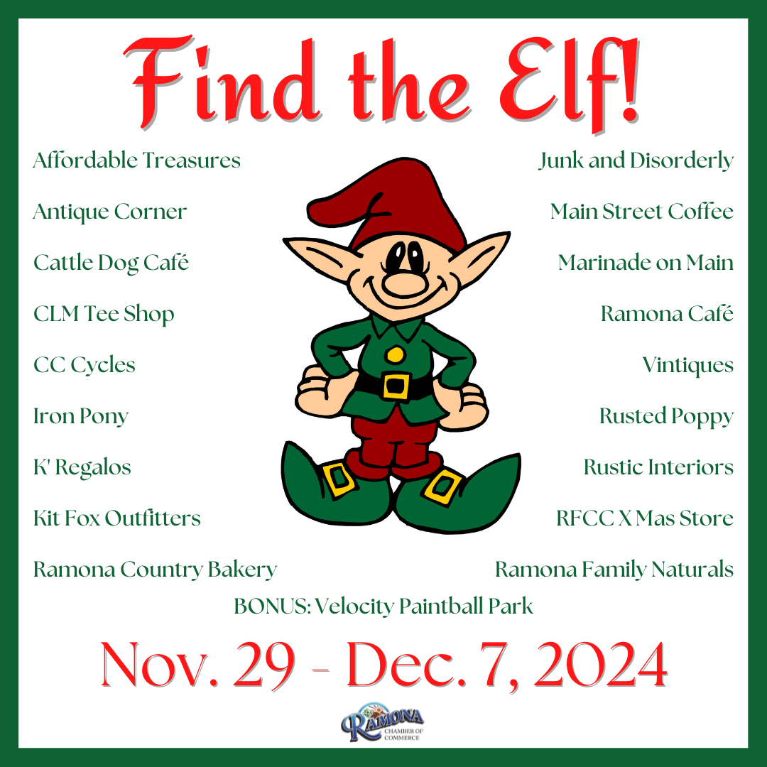 The $2,500 Ramona Shopping Spree and Find the Elf Contest have begun! The 32nd Annual Christmas Tree Lighting and Candlelight Dinner is happening this Saturday, December 7th! More info below. | |