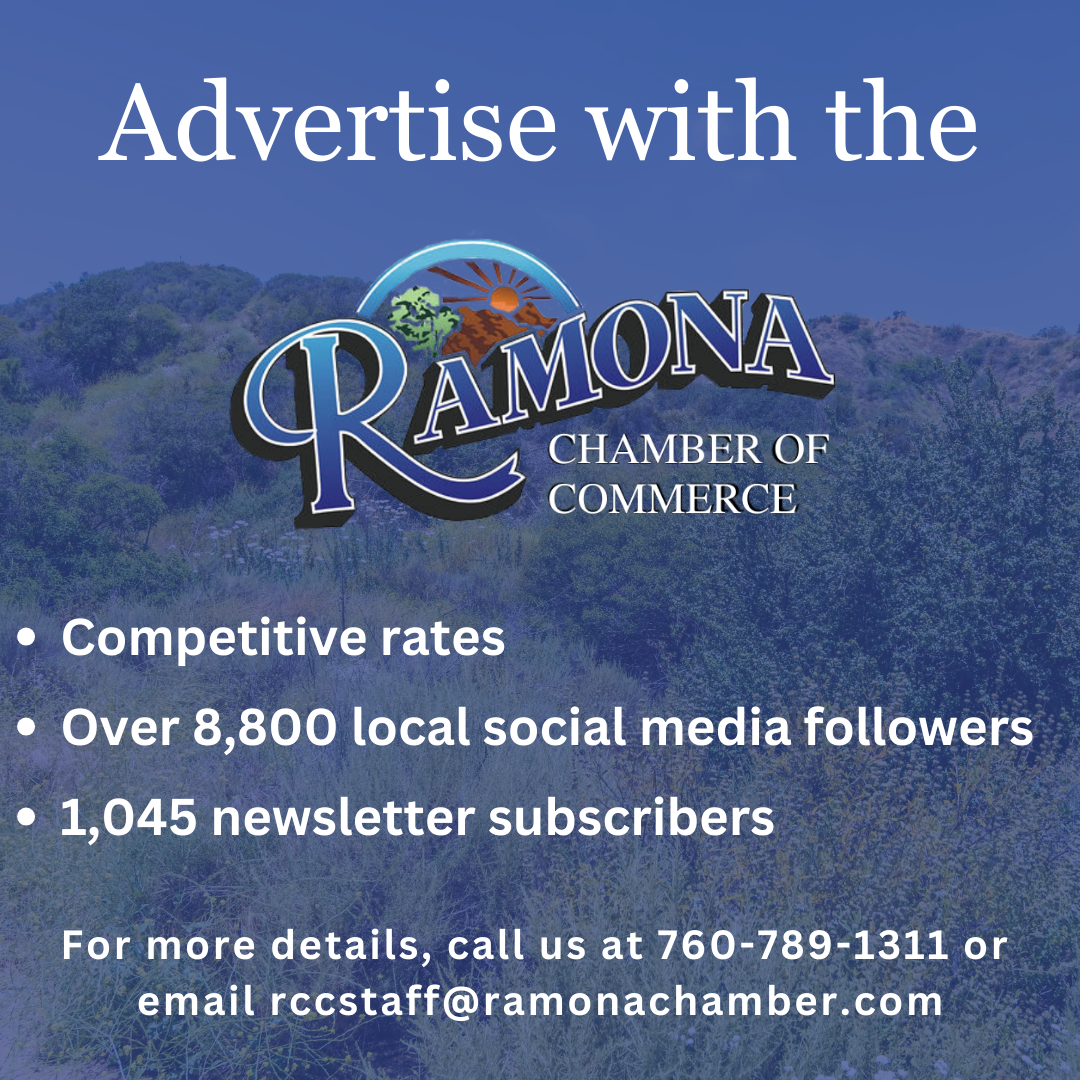 Please contact the Chamber Office at 760-789-1311 or rccstaff@ramonachamber.com for rates and more information.