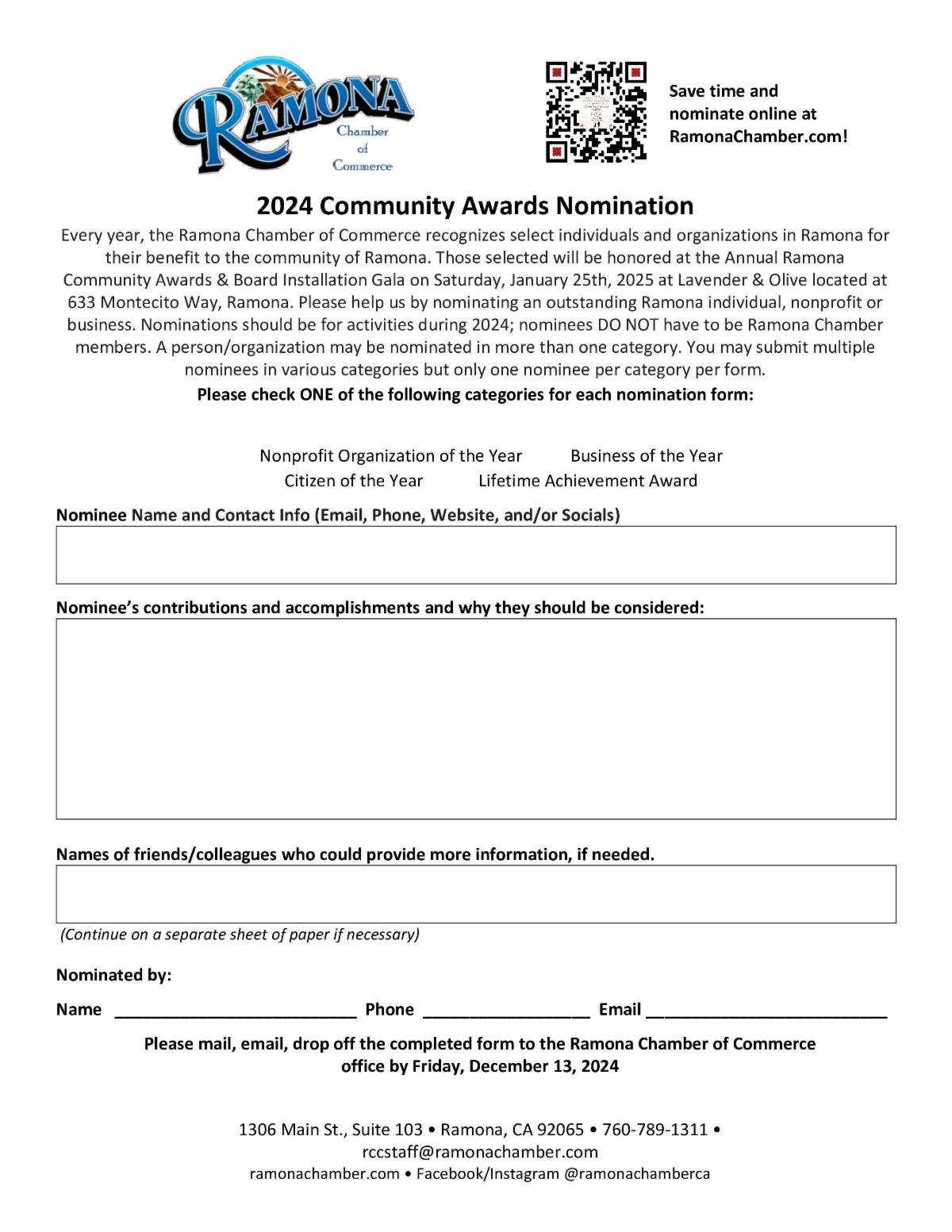Click the form below to download or visit our website to use the online nomination form at: Installation Dinner – Ramona Chamber of Commerce