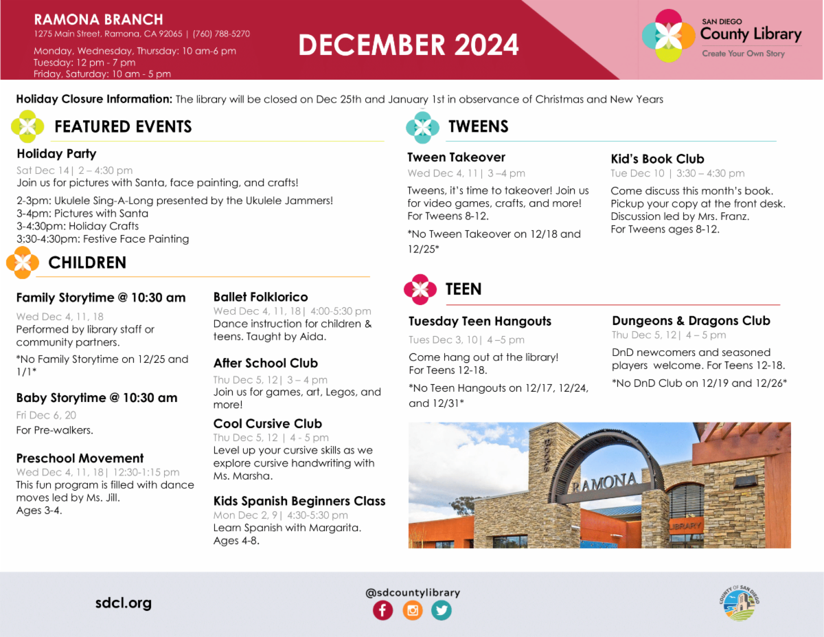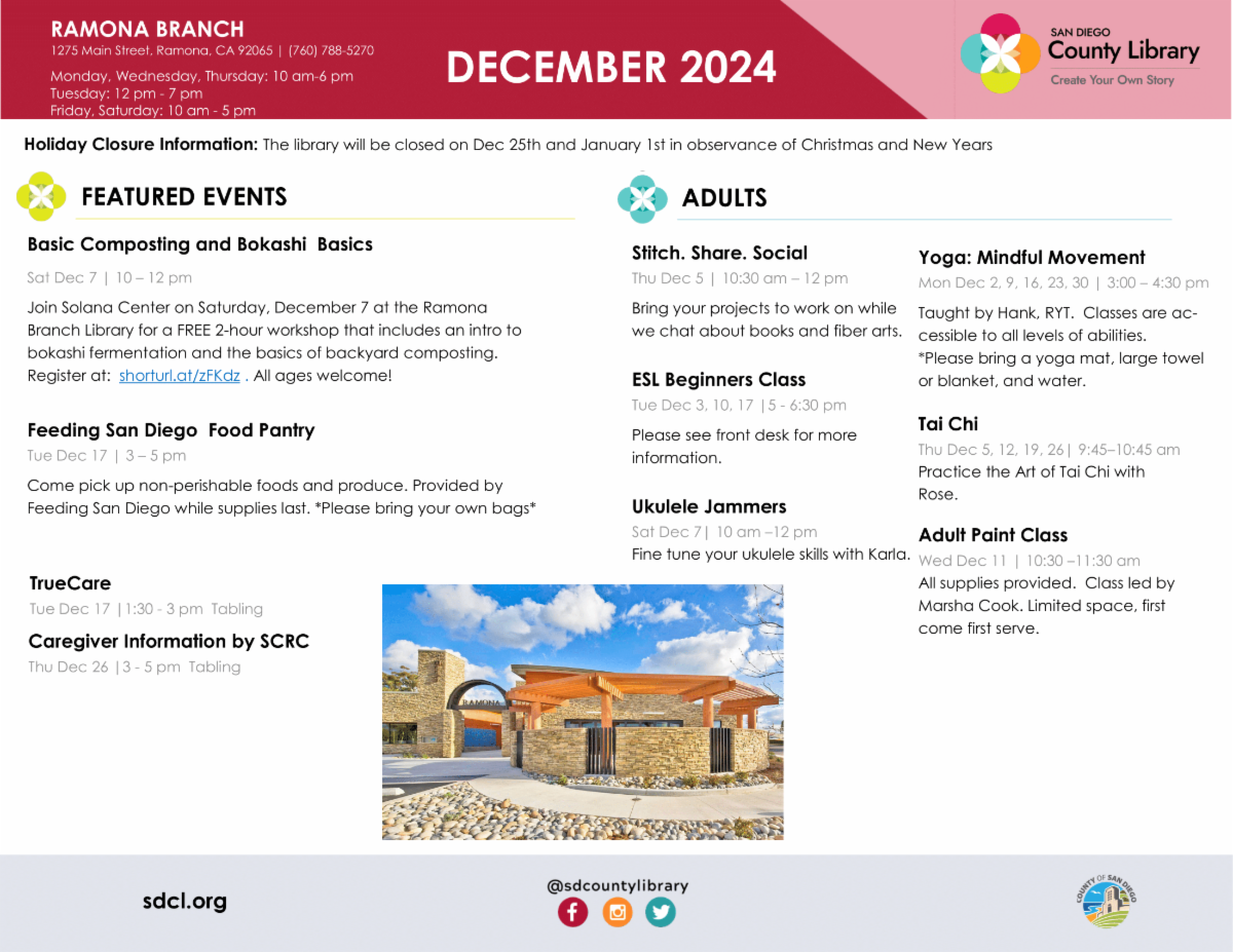 For more information, please visit their website at: https://www.sdcl.org/locations/28/ or follow the Friends of Ramona Library on social media at @friendsoframonalibrary | |