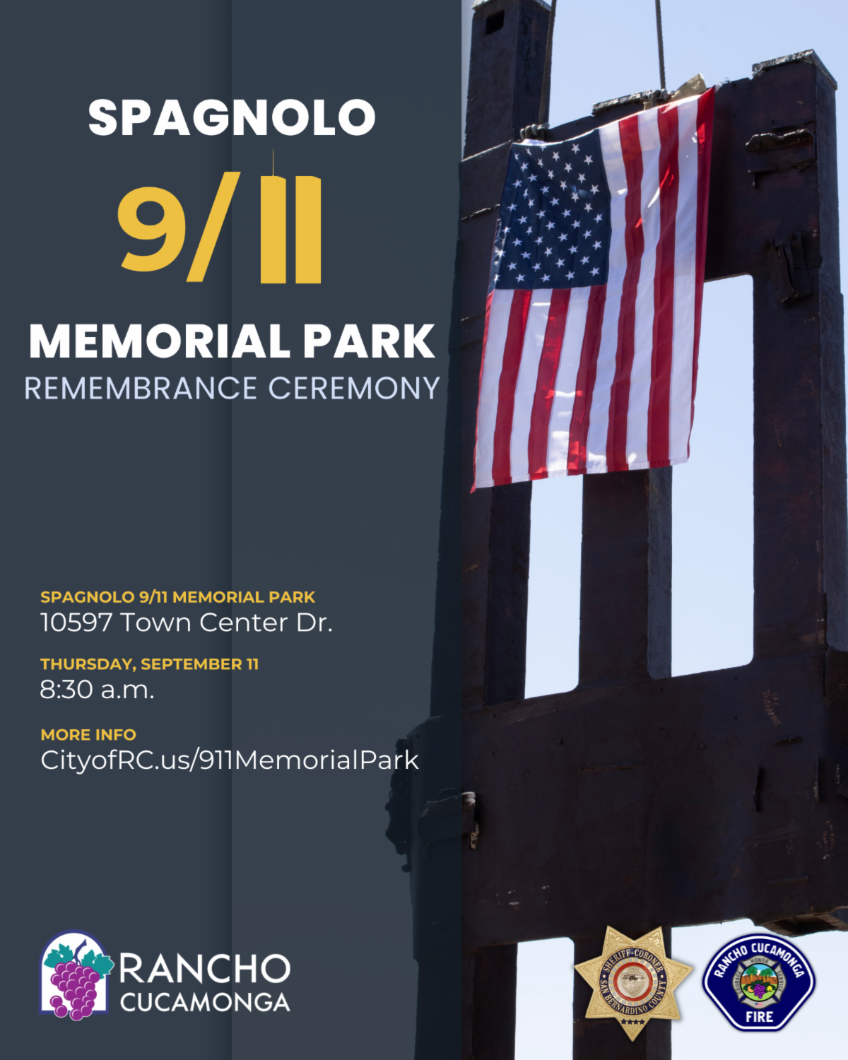 Join the City of Rancho Cucamonga, Fire District, and Police Department as we commemorate the anniversary of September 11, 2001, at the upcoming 9/11 Remembrance Ceremony on Wednesday, September 11, beginning at 8:30 a.m. The ceremony will be located at its new, permanent home, the Spagnolo 9/11 Memorial Park (10597 Town Center Dr.).