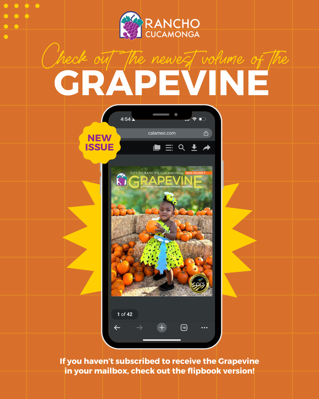 You can also sign-up to receive a printed copy of future Grapevine publications to be mailed to your home three times a year by clicking HERE. To receive your FREE copy of the Grapevine, you must be a Rancho Cucamonga resident and a subscriber.