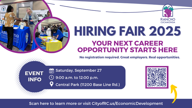 Looking for a job close to home? Don’t miss the City of Rancho Cucamonga’s annual Hiring Fair, where local businesses will be on-site and actively recruiting for open positions. No registration is required—just show up ready to explore new opportunities.