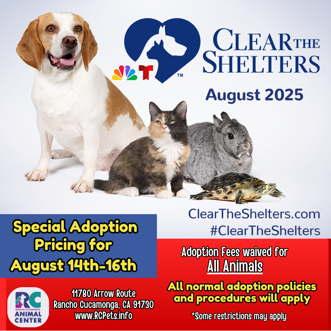 Looking to add a furry friend to your family? Now’s the perfect time! The Rancho Cucamonga Animal Center (11780 Arrow Rte.) is waiving all adoption fees for all animals from August 14 through August 16 during our Clear the Shelters event.