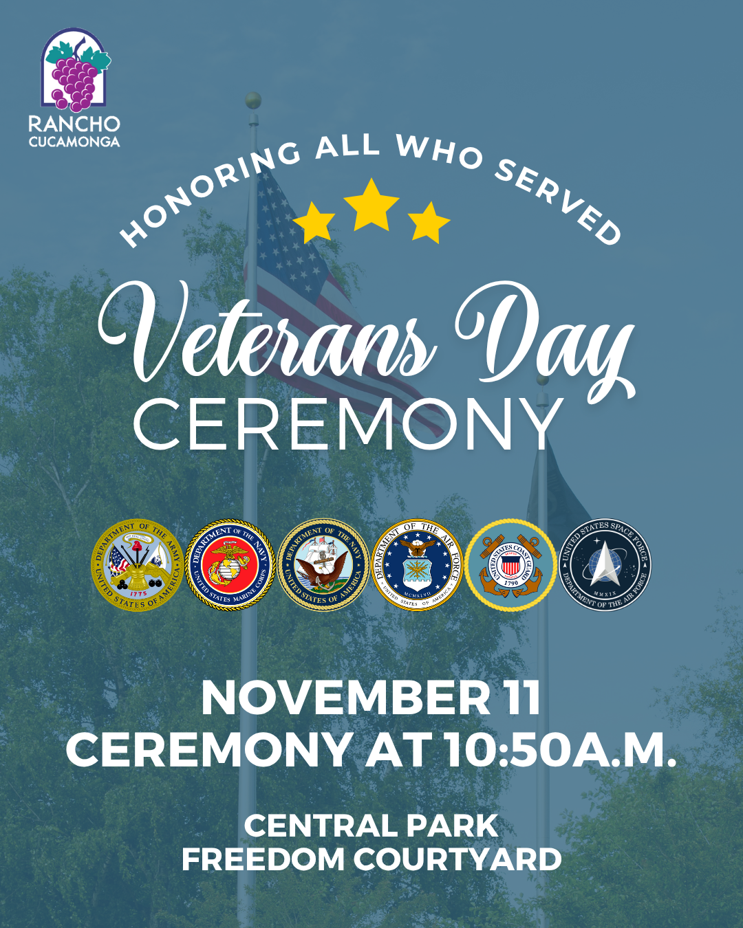 Join us on Tuesday, November 11, at 10:50 a.m. at the Freedom Courtyard at Central Park (11200 Base Line Rd.). as we come together to honor the brave men and women who have served our country at the 2025 Veterans Day Ceremony. A complimentary breakfast will be provided at 9:30 a.m.