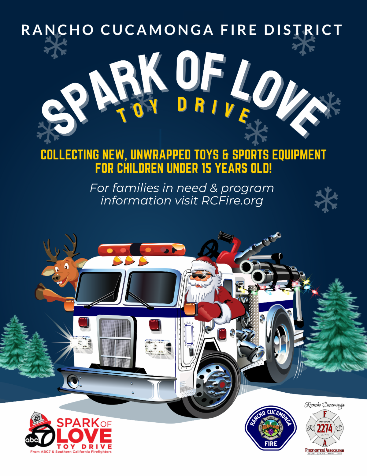 The Rancho Cucamonga Fire District and Rancho Cucamonga Firefighters' Association are participating in the annual Spark of Love Toy Drive. All eight fire stations and City Hall will be accepting new, unwrapped toys and sporting goods for children under 15 years old. While you are out shopping, please know we always need toys for children ages between 12 to 15 years old! These are the stations where you can drop off your donations: