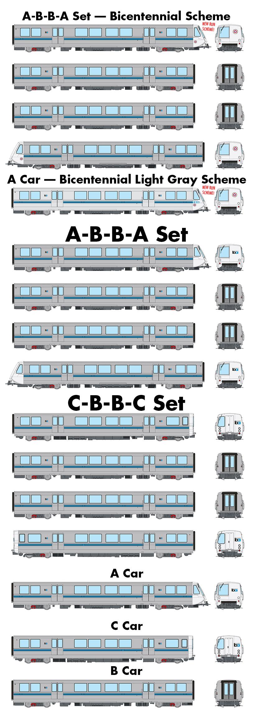 | Don't forget on this run we're offering TWO Bicentennial schemes: an A-B-B-A set as well as the single light gray A car, which was a standalone test scheme. Check out some of the 3D renders we have of those schemes, below. | |