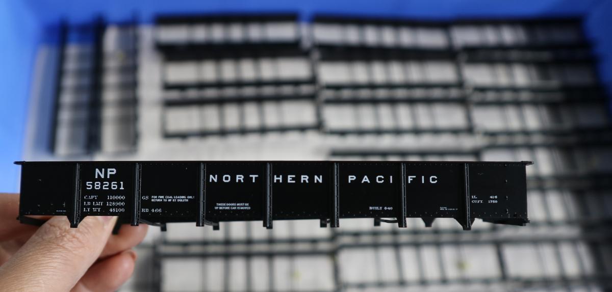Northern Pacific Drop-Bottom Gondolas. Lettering is finished on these!