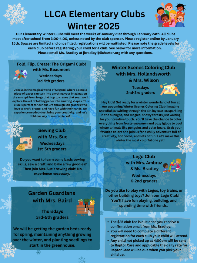To sign up for an elementary school club, please complete the form linked below, or contact Ms. Bradley, Club Organizer, at jbradley@llcharter.org Elementary Club Registration | |