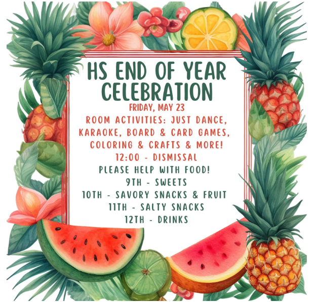 We are also planning some fun activities for the high school students on Friday (Last Day - Noon Release). We ask that each grade level help with specific food items: