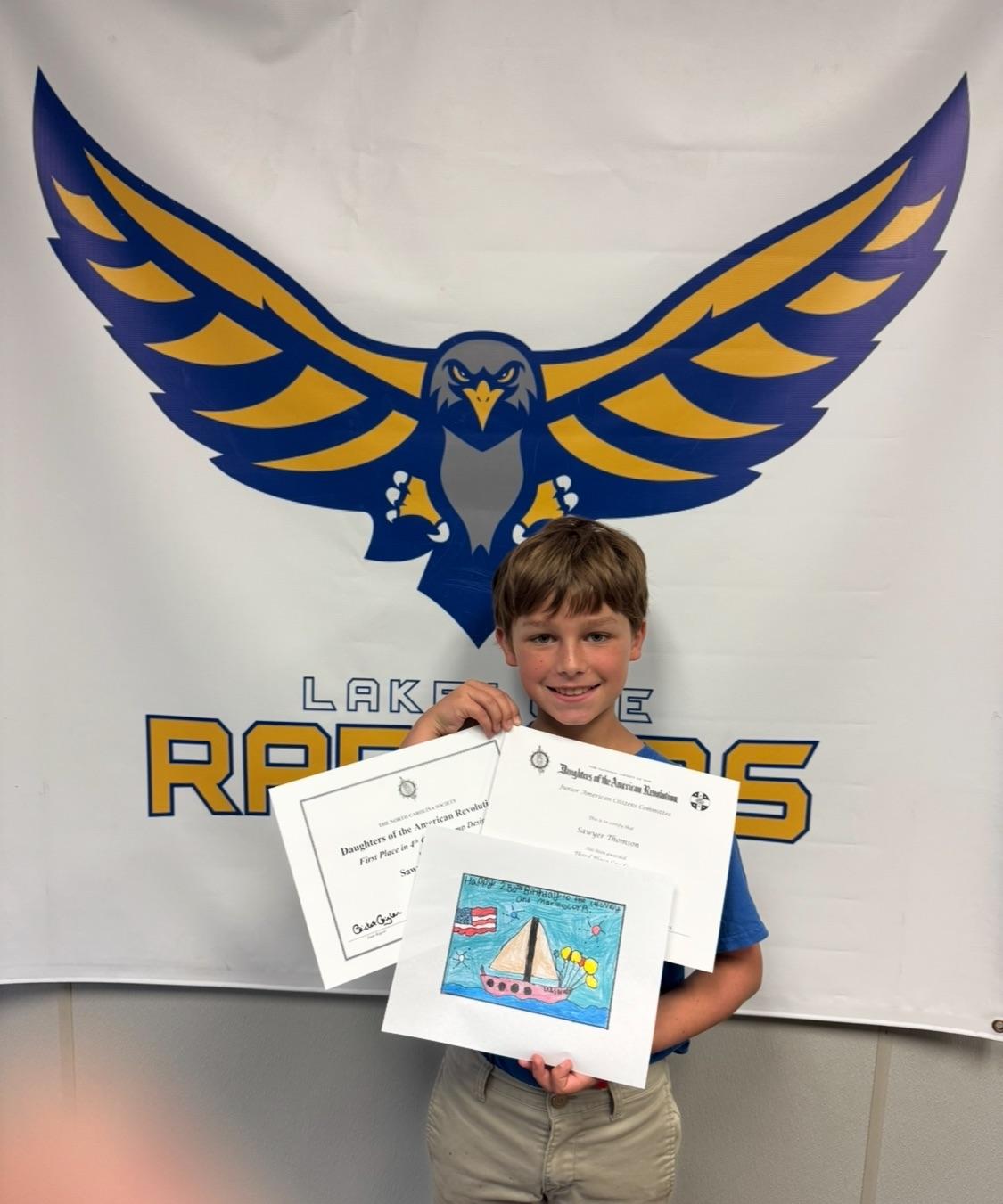 Each year our elementary students enter the Daughters of the American Revolution (DAR) art, essay, and stamp competition. This year's theme is "Happy 250th Anniversary of the Navy & Marines." This year our very own Sawyer Thompson, 4th grade student, WON first place in the competition for his art work in the stamp design contest. Sawyer will now compete at the national level. We are so very proud of Sawyer. Congratulations!