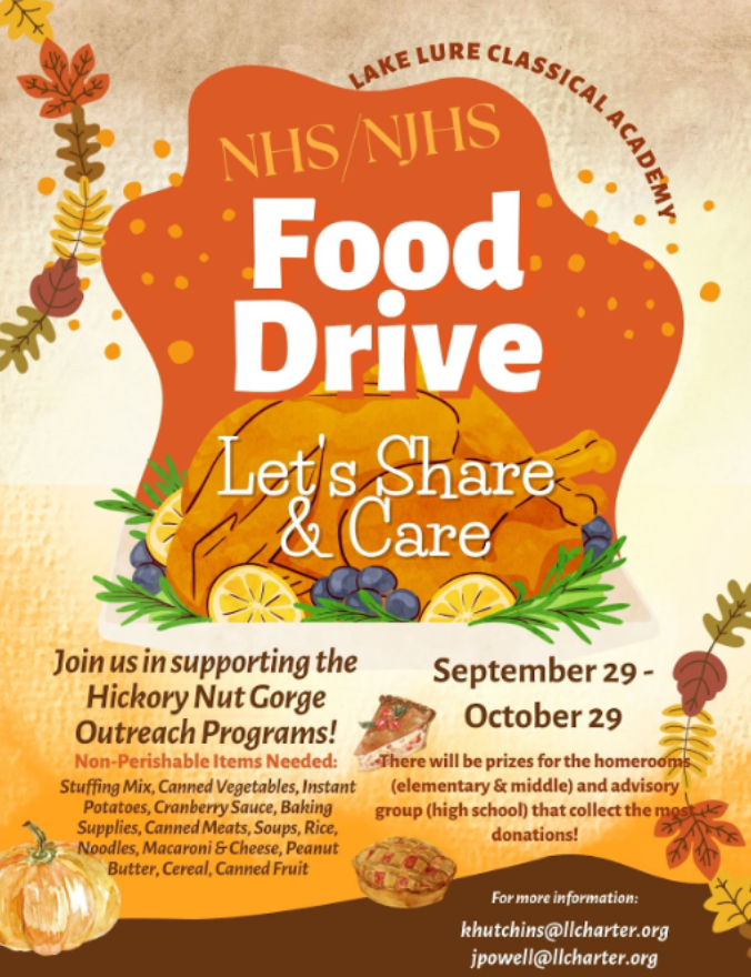 | | The NHS & NJHS are hosting a canned food drive to benefit the Hickory Nut Gorge Outreach programs! Students are encouraged to visit family, friends and neighbors to try to help collect canned food items. The homerooms at the elementary and middle school level, and the 9/10 or 11/12 grade level groups in the high school that collect the most cans will win great prizes! The canned food drive ends October 29. | | |