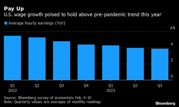 (Mar 3) — The February jobs report on Friday is forecast to show average hourly earnings advanced another 0.5% last month, pushing the year-over-year gain to 5.8%. Excluding two pandemic-distorted prints in 2020, the annual increase would be the strongest in data back to 2007.