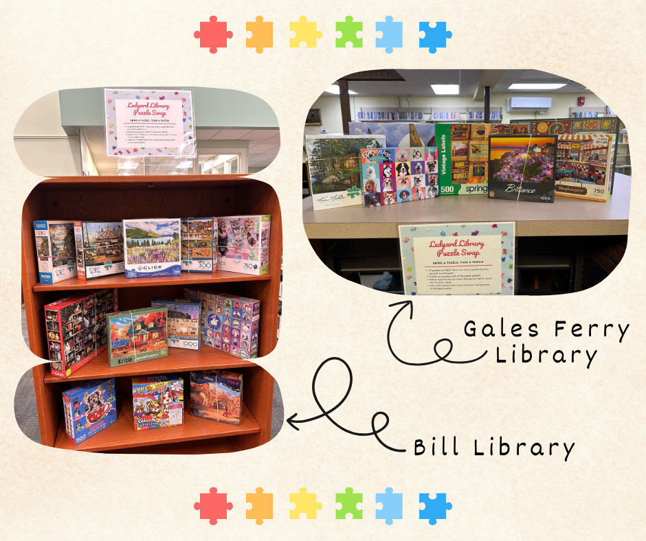 Visit Bill Library or Gales Ferry Library to choose from a variety of FREE puzzles. Bring a puzzle, take a puzzle! Have puzzles you no longer need? Donate them to the library for others to enjoy! It's all complimentary, and you don't even need a library card. 🧩