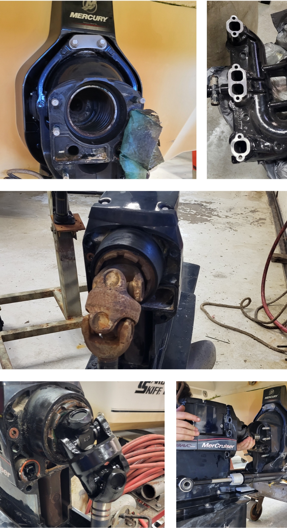 During the process, the technician identified a leaking drive and found water intrusion in the exhaust bellows, along with a cracked gear lube hose. The intermediate bearing and bellows hoses were in rough shape, as seen in the photos. We replaced the bearing, bellows hoses, and added fresh zincs before reinstalling the drive. |
