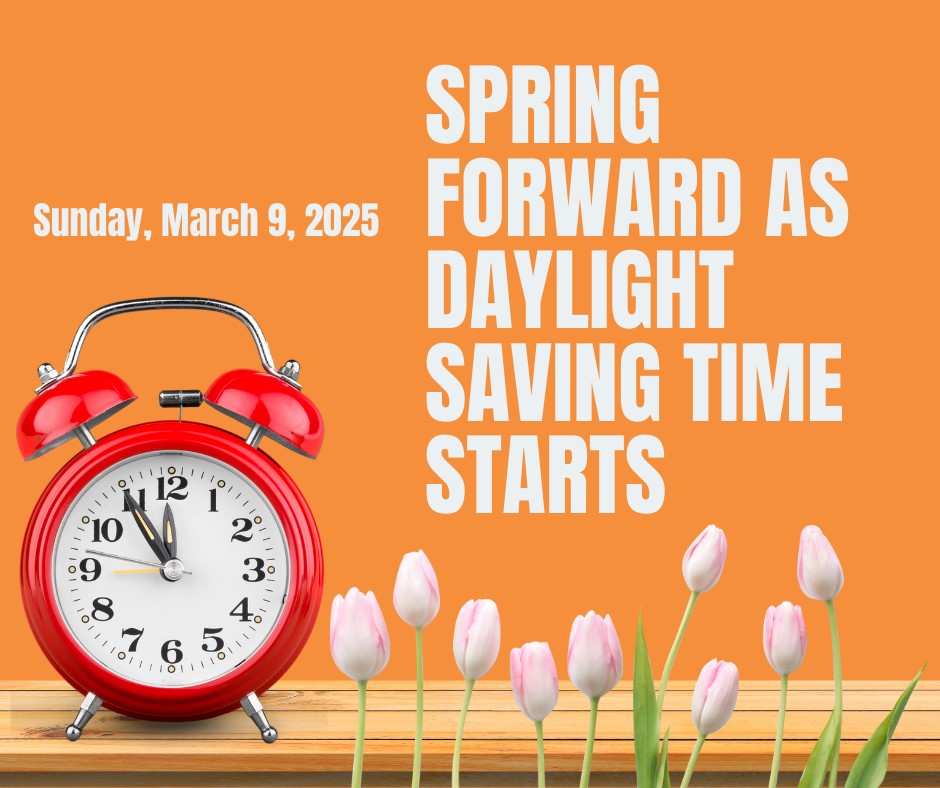 Remember to set clocks ahead one hour on Saturday before going to bed. Daylight saving time begins on Sunday, March 9 at 2:00 a.m., moving time ahead by one hour to 3:00 a.m.