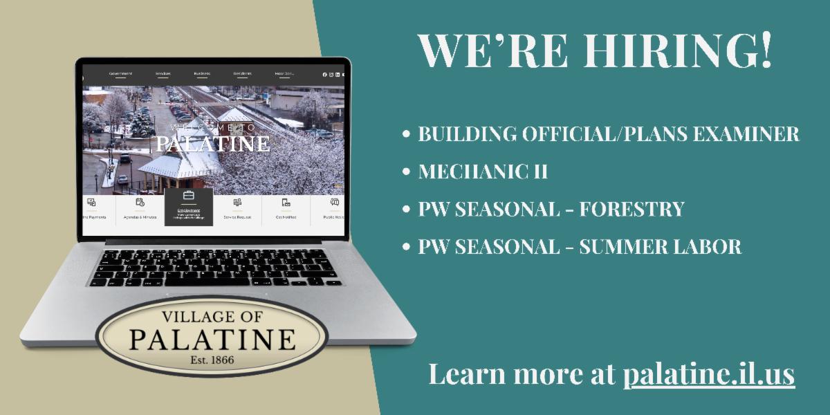 Continuing the longstanding tradition of twice a year, Councilman Lamerand and Councilman Millar are hosting their combined Spring Advisory/Town Hall Meeting at 7:00 p.m. on Wednesday, March 19, 2025 at the Palatine Village Hall Council Chambers. Stop by to hear about developments, ask questions, and meet your neighbors. Everyone is welcome to attend, even if you don't live in District 1 or 2.