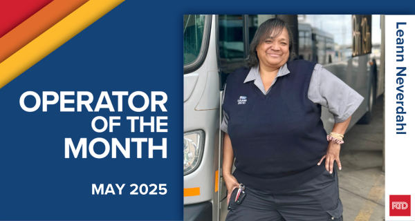 Leann Neverdahl from RTD's Platte Division is May's Operator of the Month. Neverdahl was selected after rendering assistance to a customer who had fallen due to a medical issue. She reported the incident to dispatch and remained with the customer in the snowy weather until emergency services arrived. Neverdahl went to great lengths to aid the customer, such as contacting the customer’s husband to get her medical information, relaying that to first responders.