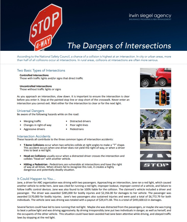 This month we are continuing with our new section in this newsletter that covers safety tips that we can all use in our everyday lives. This month's topic is on Dangers of Intersections. Click on the image below to read the 2 page article.