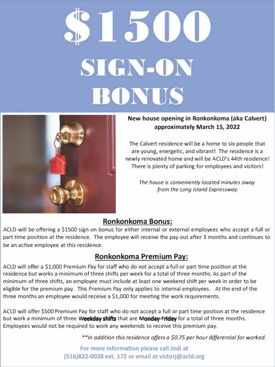 We would like to note that the agency’s newest house Calvert in Ronkonkama is opening this month and there is an opportunity for anyone to join the house and receive a signing bonus. Click here for details and contact Human Resources at victorj@acld.org with any questions.