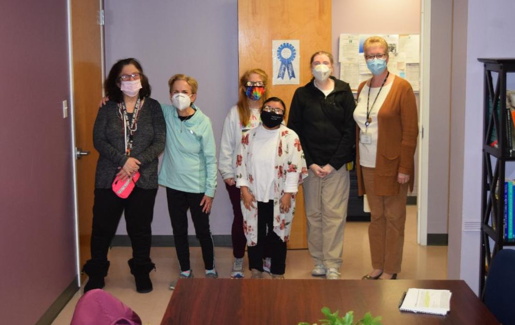 (left to right) Abby Levinson, Merril Krassner, Allison Royar, Tina Boland and Sharon Giselmann, ACLD's Employee Development and Engagement Manager. (front) Marlin Heely.
