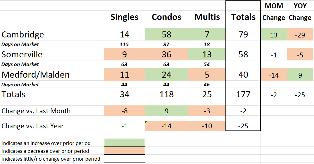 As the calendar turned to February, the inventory challenges in the Greater Boston Area real estate market persisted with a slight drop over last month (-2 units) and a larger decline over last year (-25 units) in available properties. The trends were somewhat inconsistent, with most markets/property types down YOY with only Malden/Medford up 9 units. Condos were up in both Medford/Malden and Cambridge MOM, however those numbers were compared to very low levels in January. The expected Spring Selling Season jump in inventory has not yet materialized as the region experiences a cold and snowy winter season.