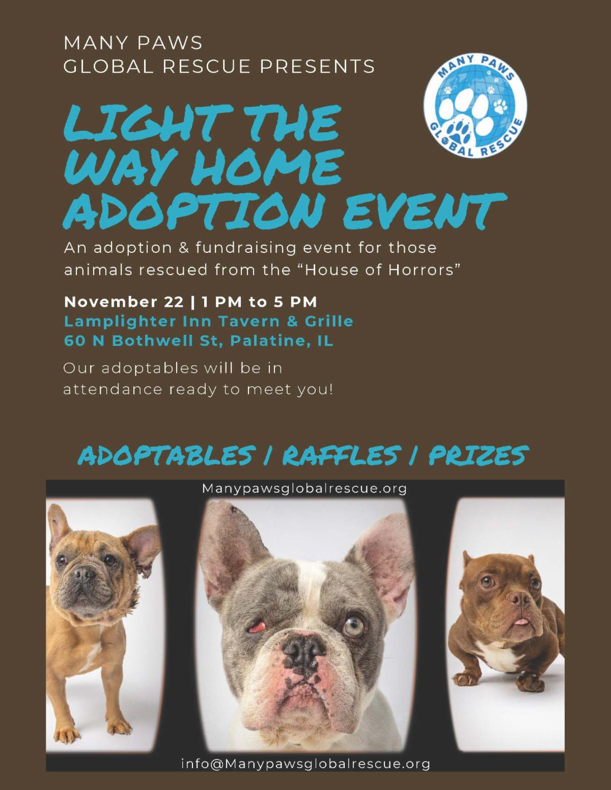 Many Paws Global Rescue presents "Light the Way Home" adoption event Saturday, November 22, 1:00 - 5:00 p.m., Lamplighter Inn Tavern & Grill, 60 N. Bothwell Street.