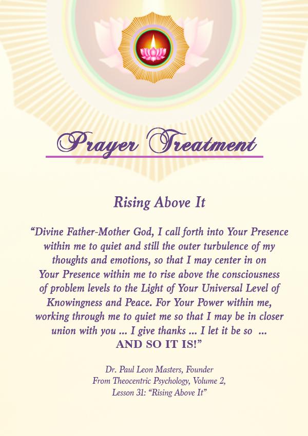 Our Father-Mother God who is in the kingdom of heavenly consciousness within our minds. Holy be your presence in our awareness. We open our minds to your kingdom of higher heavenly consciousness. Awaken our earthly direction in life to the universal will of your heavenly mind. Give us this day our daily nourishment of the presence of your spirit. And as you forgive us—so in turn, may we, by your presence in our minds forgive others. And inwardly guide us away from all that is not of your presence into your light. For yours is our true inner power and the glory of our true selfhood for ever and ever.