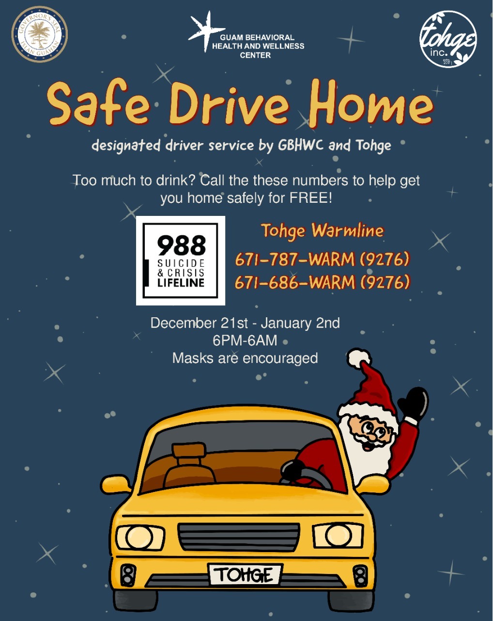 The season can be a difficult time for some, please share the Holiday Crisis Hotline with anyone who can use an ear or is feeling blue: (671) 647-8833.