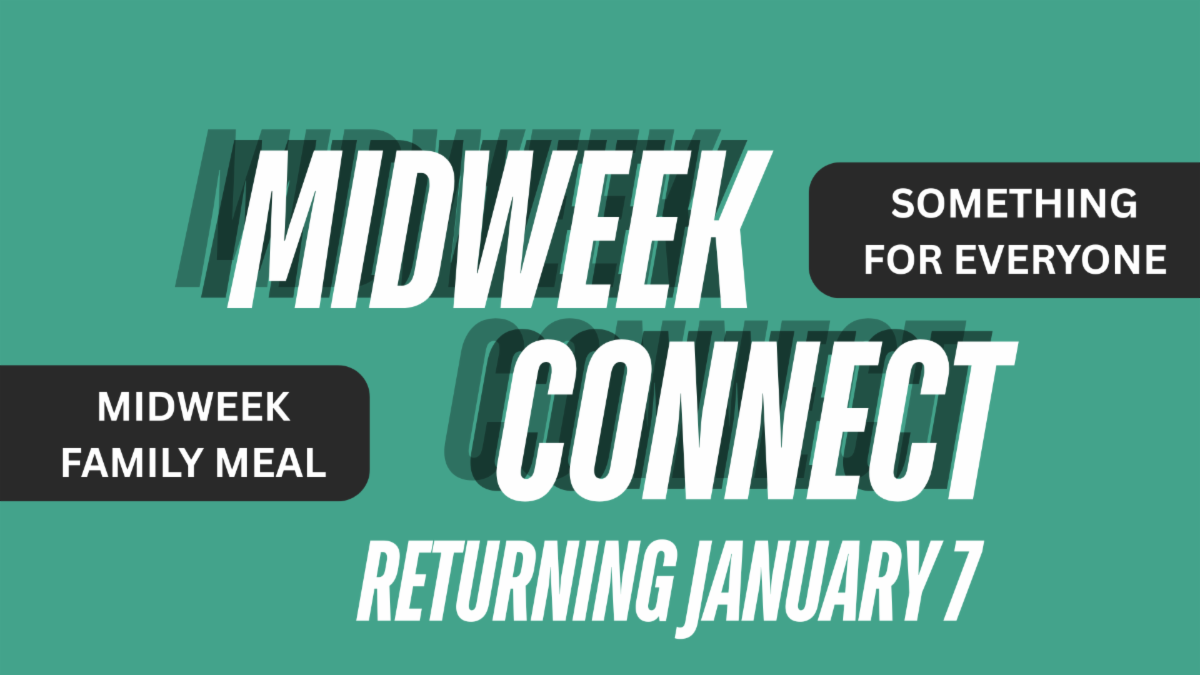 We’re so excited to announce that Midweek Connect is returning beginning Wednesday, January 7! Mark your calendars and get ready for another season of great meals, meaningful community, and Bible studies for all ages. We’ll gather weekly through April 29, with a few scheduled breaks (no Midweek on February 18, March 18, or April 1).