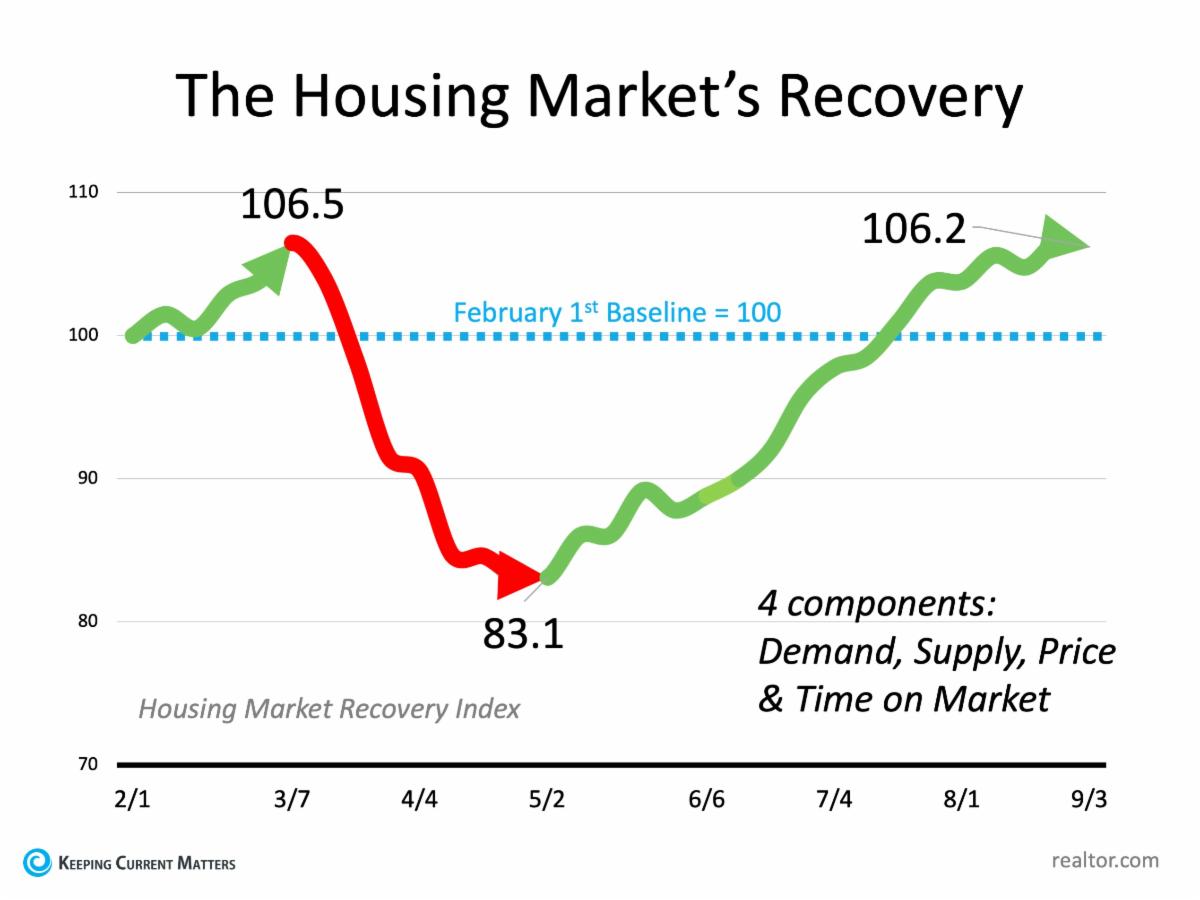 Housing Market RecoveryThe economy was intentionally put on pause this spring in response to the COVID-19 health crisis. Many aspects of the common real estate transaction were placed on hold at the same time. Thankfully, technology and innovation helped the industry power forward, and business gradually ramped back up as shelter-in-place orders were lifted. The result? Total transformation of the market from rock-bottom lows to exceptional highs. Today, the housing recovery is being called truly remarkable by many experts and is far exceeding expectations. From pending home sales to purchase applications, buyers are back in business and homes are selling - fast. According to the Housing Market Recovery Index by realtor.com, the market has surpassed pre-pandemic levels, and has regained the strength we remember from February of this year (See graph below):