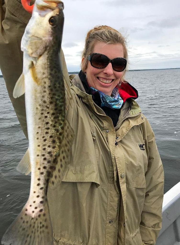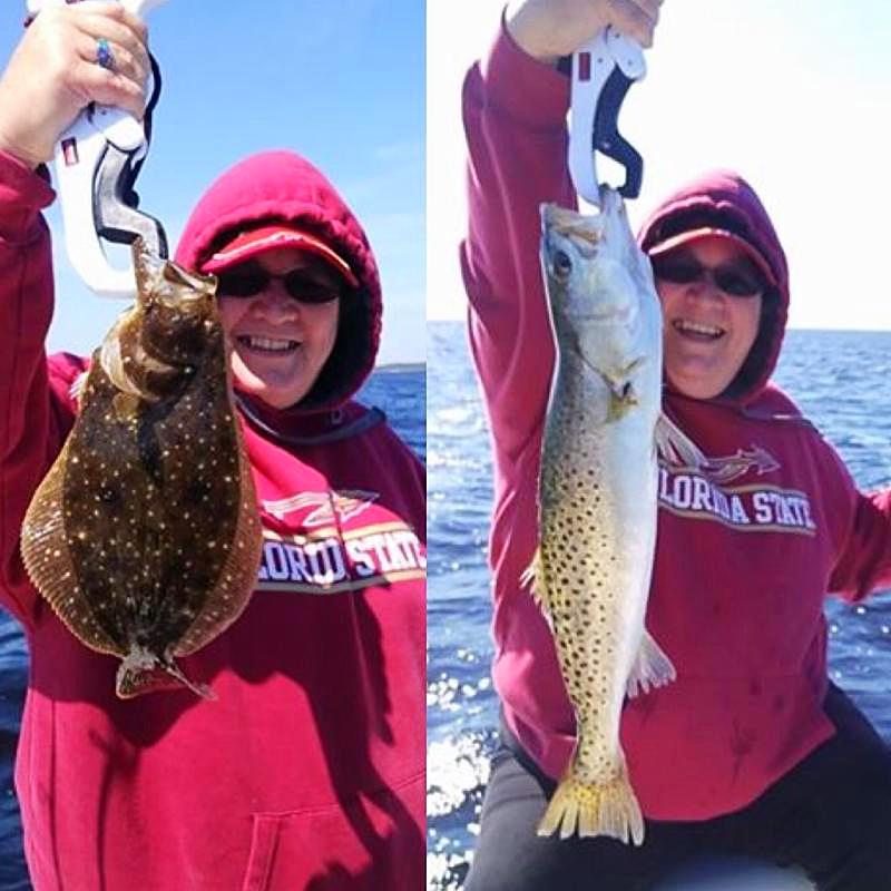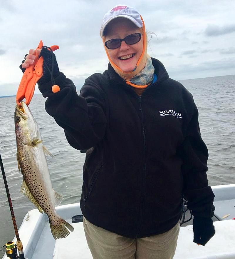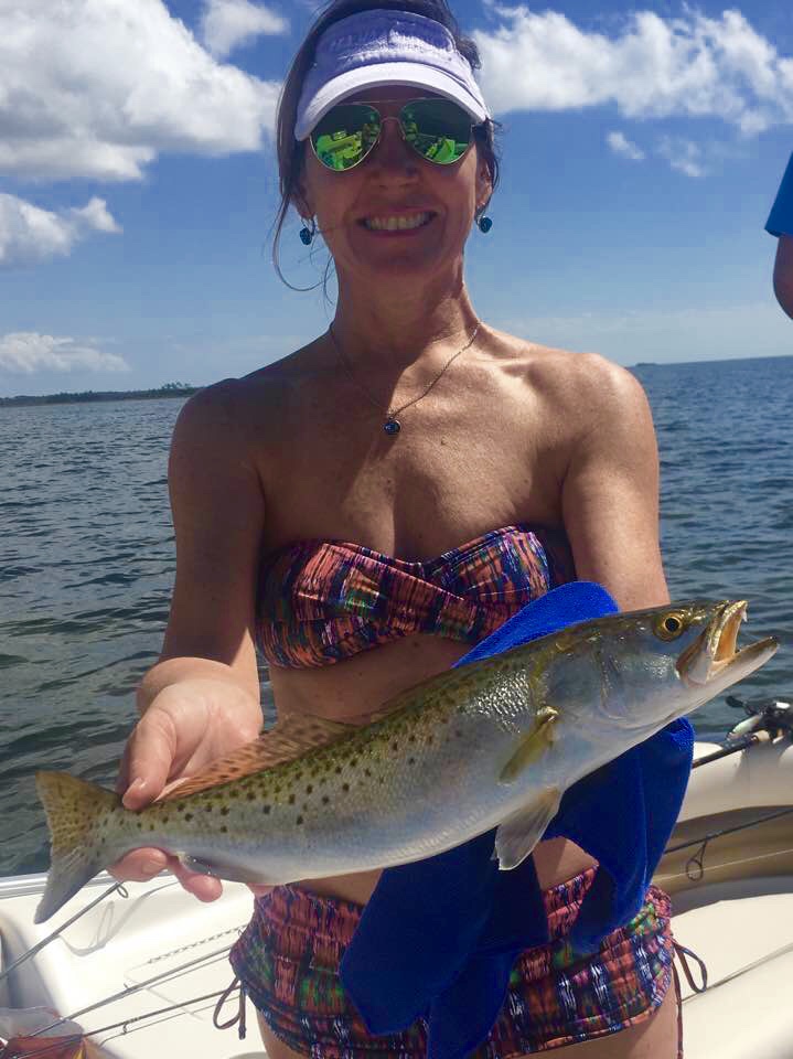 | Genene Croy from High Springs, FL, hooked her first trout with the help of Capt. Skipper. |