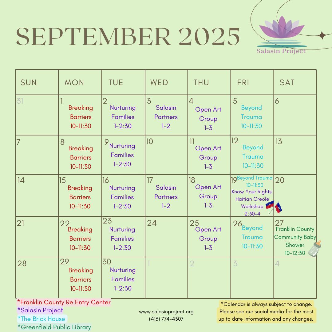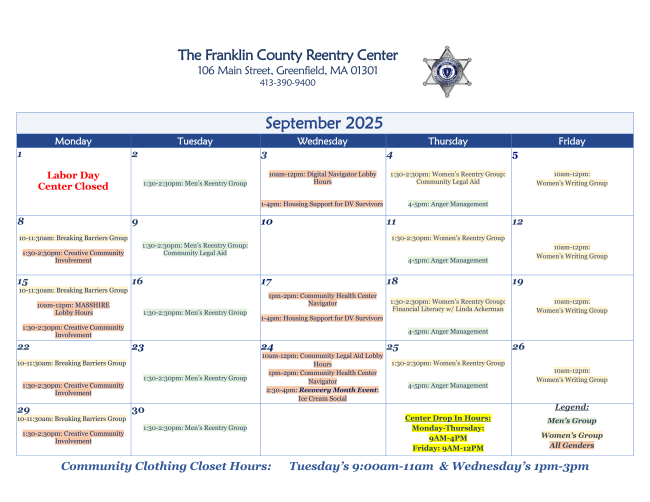| | Wednesdays September 17 - December 10 Nurturing Fathers | | Wednesdays Virtual All Recovery Meeting | | Wednesdays BIPOC ALT2SU (Alternatives to Suicide) | | Wednesdays - Wendell Library Playgroup with Sylvia | | Wednesdays - Playgroup at the Leverett Library with Gillian | | Wednesdays HEROES Study Hub at GCC | | Wednesdays Health Connector & Mass Health Navigator Drop In Hours | | Wednesdays Face The Storm Men's Group | | Every Other Wednesday Salasin Project Housing Support | | First Wednesday Gentle Yoga and Breathwork with Jennifer | | First Wednesday - Money Wise Financial Education Sessions | | Third Wednesday - Fatherhood Meetup | | Last Wednesday - Office Hours With An Attorney | | Wednesdays and 2nd Saturdays The Nest Community Closet | | First Thursdays Through November Ukulele Monthly Class | | First & Third Thursdays Parent Support Group | | First & Third Thursdays Eagles Meeting | | Thursdays Music Tween Group | | Thursdays Coffee Hour at the Brick House | | Thursdays Beyond Trauma Group in Spanish | | Thursdays Windows and Mirrors Playgroup | | Second Thursdays -Peer Grief Support After Overdose Death | | Second & Fourth Thursdays Community Meeting | | Third Thursdays Court Service Center Walk-in Days at the North Quabbin Patch | | Fridays August 29 - October 10 Beyond Trauma: A Healing Journey | | Fridays September 19 - October 31 Mindful Childbirth & Parenting | | Friday Peer-led Meditation Group | | Fridays FreeWrite of Franklin County | | Friday All Recovery Meeting and Drop In Recovery Coach Support | | RECOVER Project Friday Nights | |