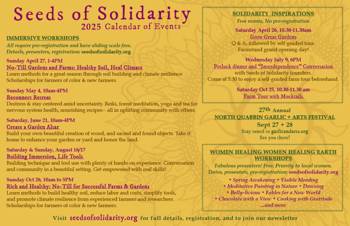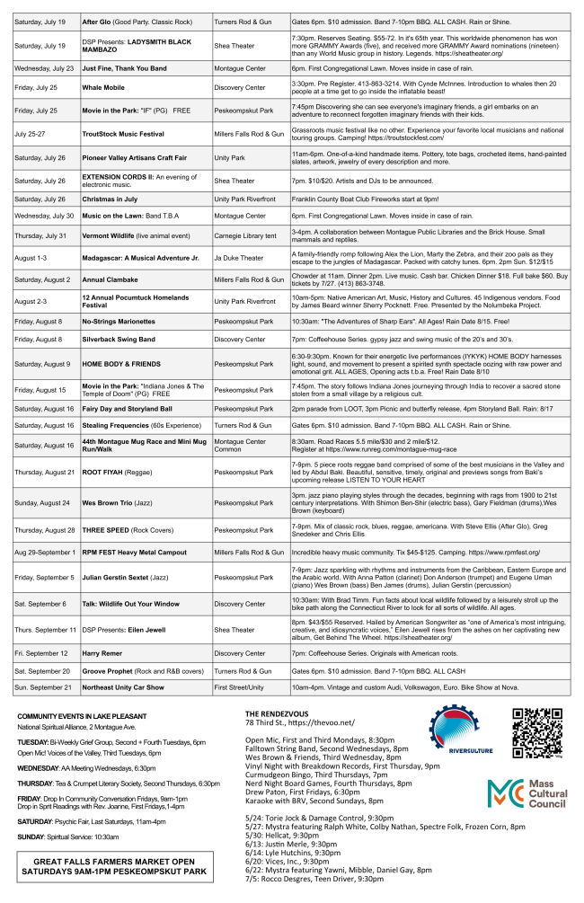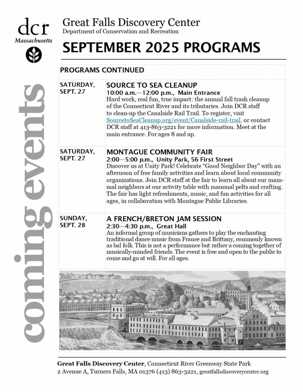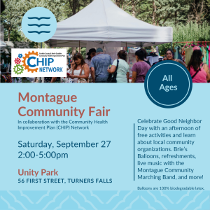 | | September 27 Harvest Festival | | September 27 Franklin County Community Baby Shower | | September 27 Erving Fall Festival | | September 27 Medieval Family Cookout | | September 27 Montague Community Fair | | September 27 - 28 North Quabbin Garlic & Arts Festival | | September 28 Free Screening of "Won't You Be My Neighbor?" | | September 29 Banners of Expression | | September 29 Indigenous Stories From This Valley And Beyond | |