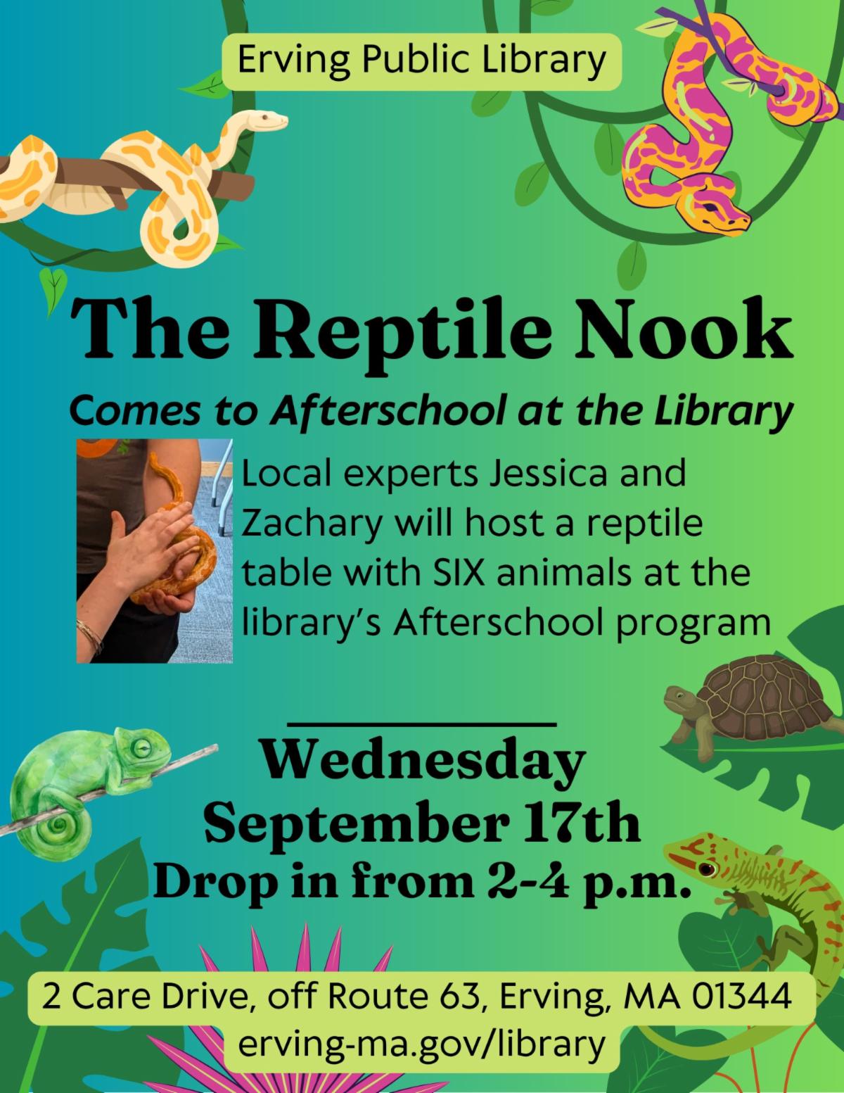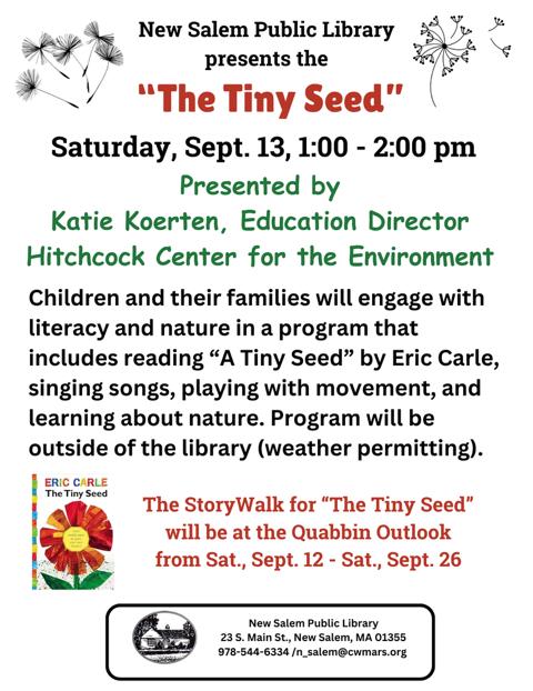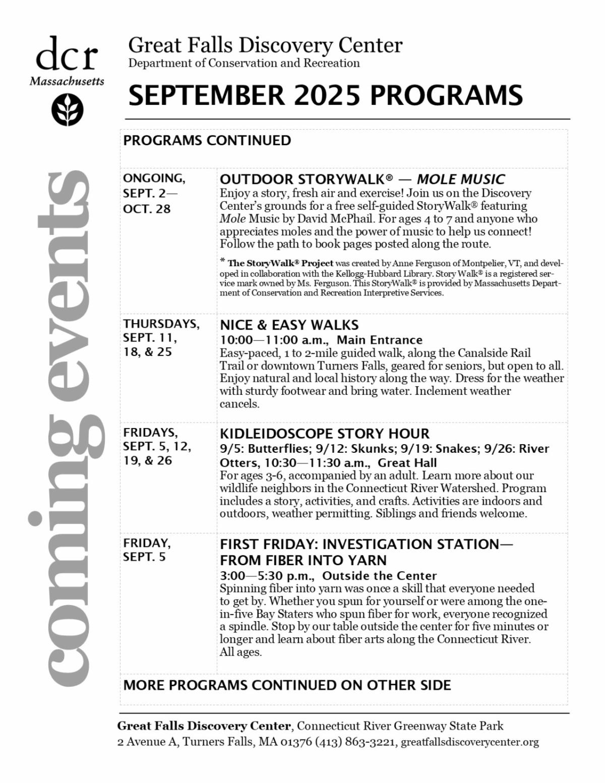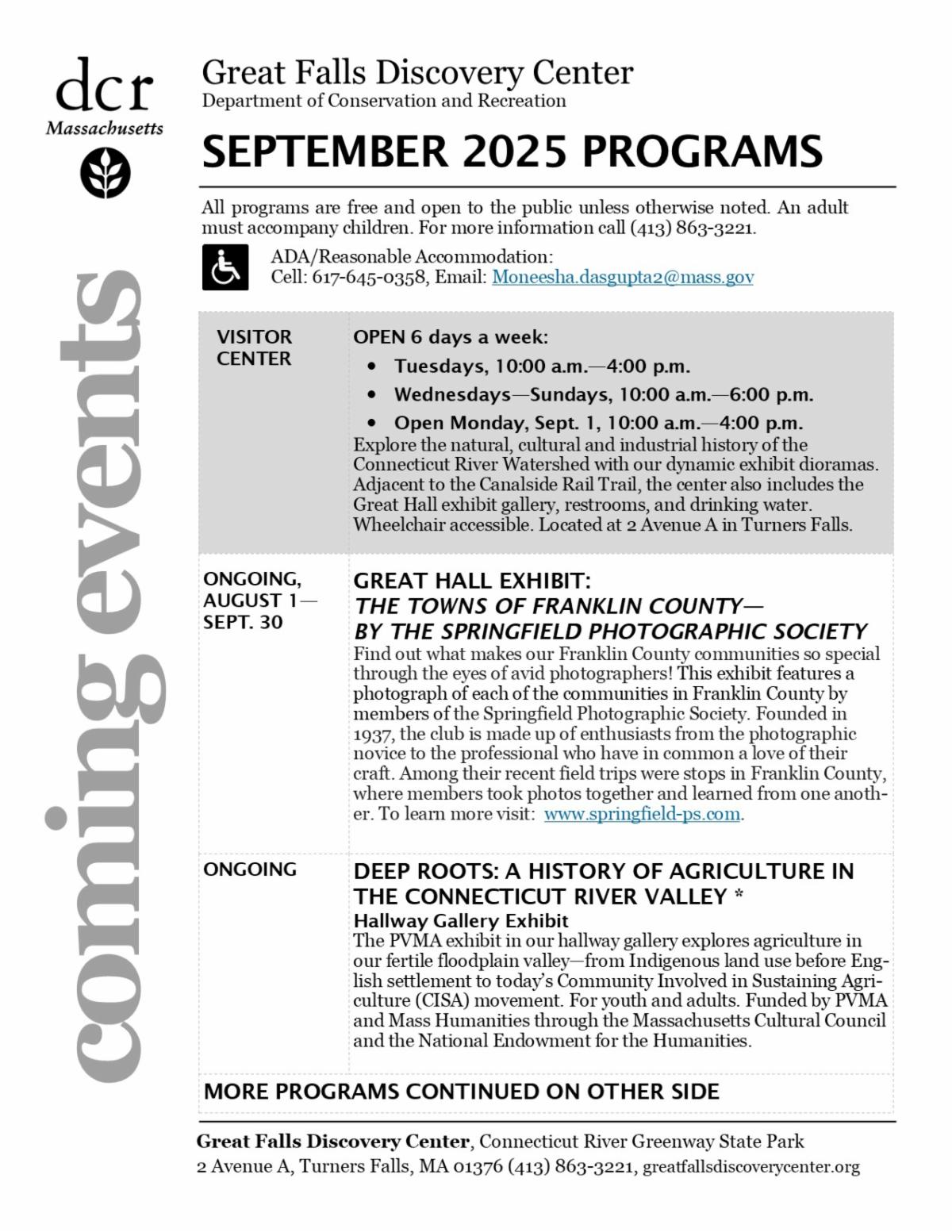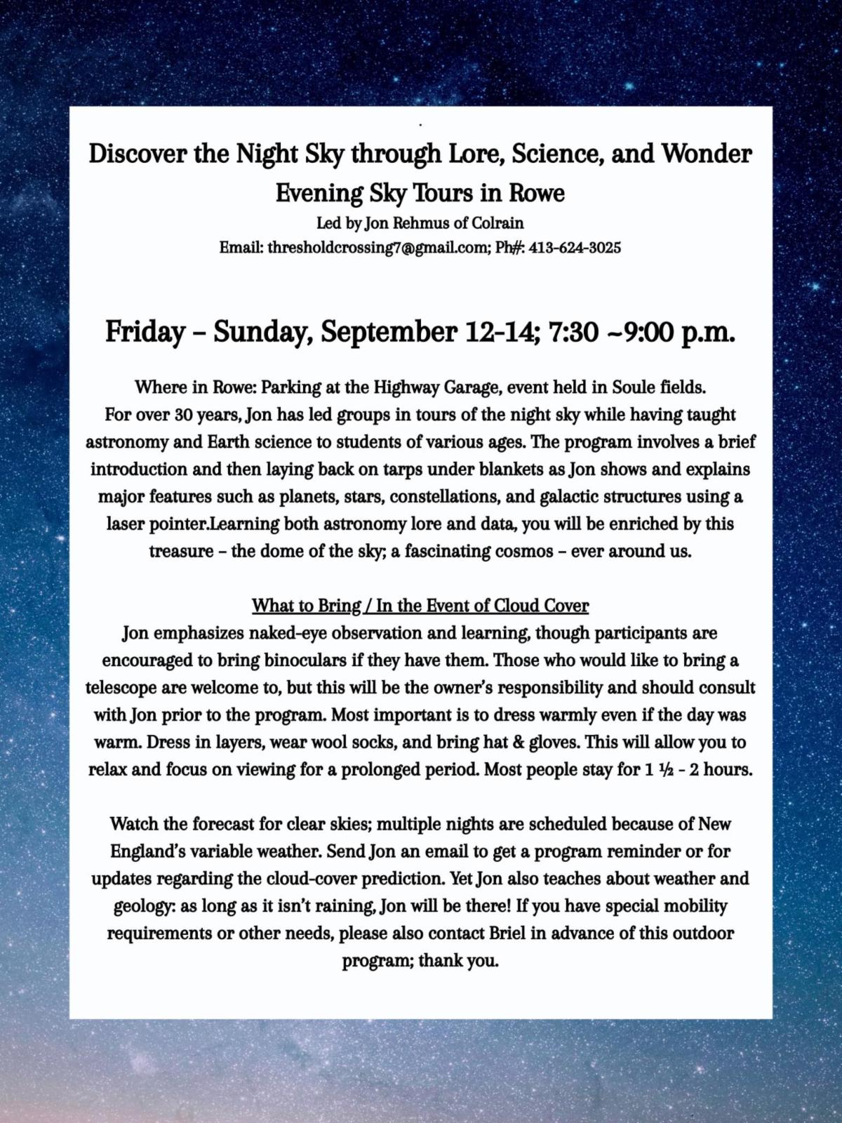 | | September 12 - 14 Discover the Night Sky through Lore, Science, and Wonder: Evening Sky Tours in Rowe | | September 13 "The Tiny Seed" | | September 13 WHWHE: Shrines to the Natural World | | September 13 Ecology of Sound | | September 16 - October 21 Introduction to Genealogical Research | | September 17 The Reptile Nook | | September 17 West County's Community Resource Fair | |