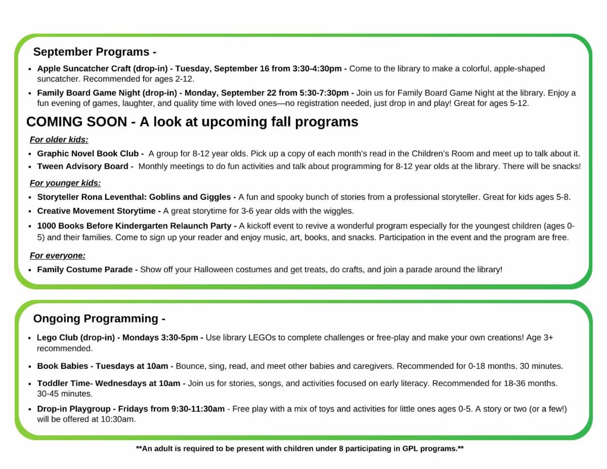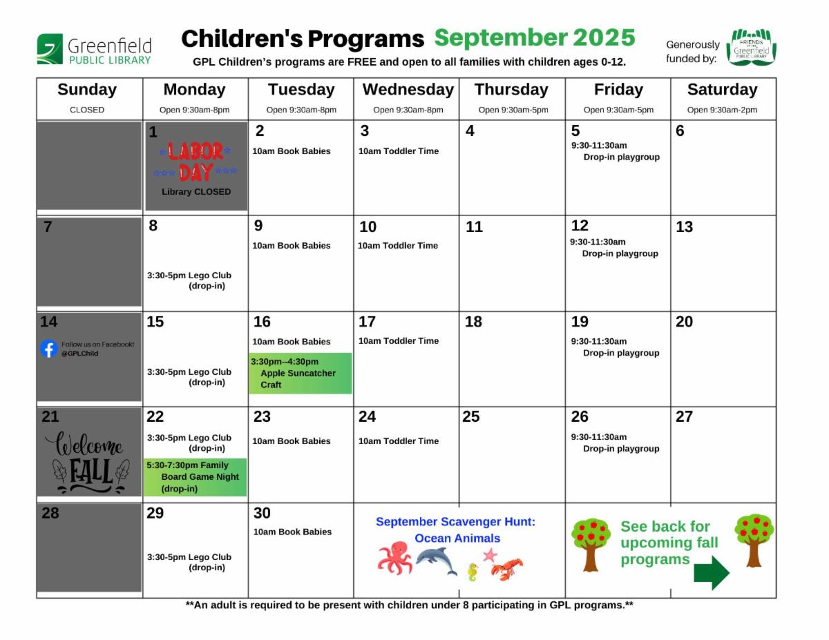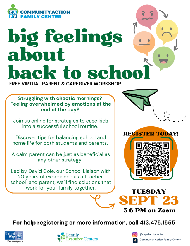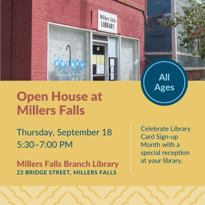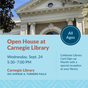 | | September 18 Family Game Night | | September 18 Open House at Millers Falls Branch Library | | September 20 Third Annual Bases and Badges Softball Tournament | | September 23 Big Feelings About Back to School | | September 24 Reusable Bag Workshop | | September 24 Open House at Carnegie Library | | September 25 - December 11 Thursdays Parenting Journey | | September 26 Talk To Me! Baby/Toddler Sign Language | |