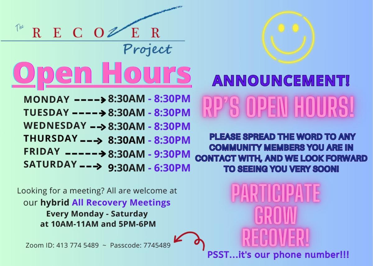 | | Hilltown Youth Recovery Theatre | | North Quabbin Recovery Center | | Seeds of Solidarity and Women Healing Women Healing Earth | | Sunderland Public Library | | Union 28 Community Network for Children Program | | Explore the Value in Hosting a Community HealthWorker Intern | | Housing Help With Greenfield Housing Authority | | SNAP Application Assistance | | Always Open! Community Labyrinth in Greenfield | | What's Happening at The NQRC | | Sundays ALT2SU (Alternatives to Suicide) | | All Recovery Meeting at The RECOVER Project | | |