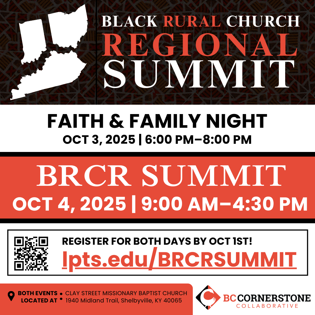 The Black Church Cornerstone Collaborative (BCCC) invites you to attend the Black Rural Church Regional Summit, a two-day gathering dedicated to empowering and supporting rural and small-town Black churches and faith-based communities in Kentucky, Indiana, and Ohio. Together, we will lift up the vital role of the Black Church as we cultivate faith, collaboration, and community.