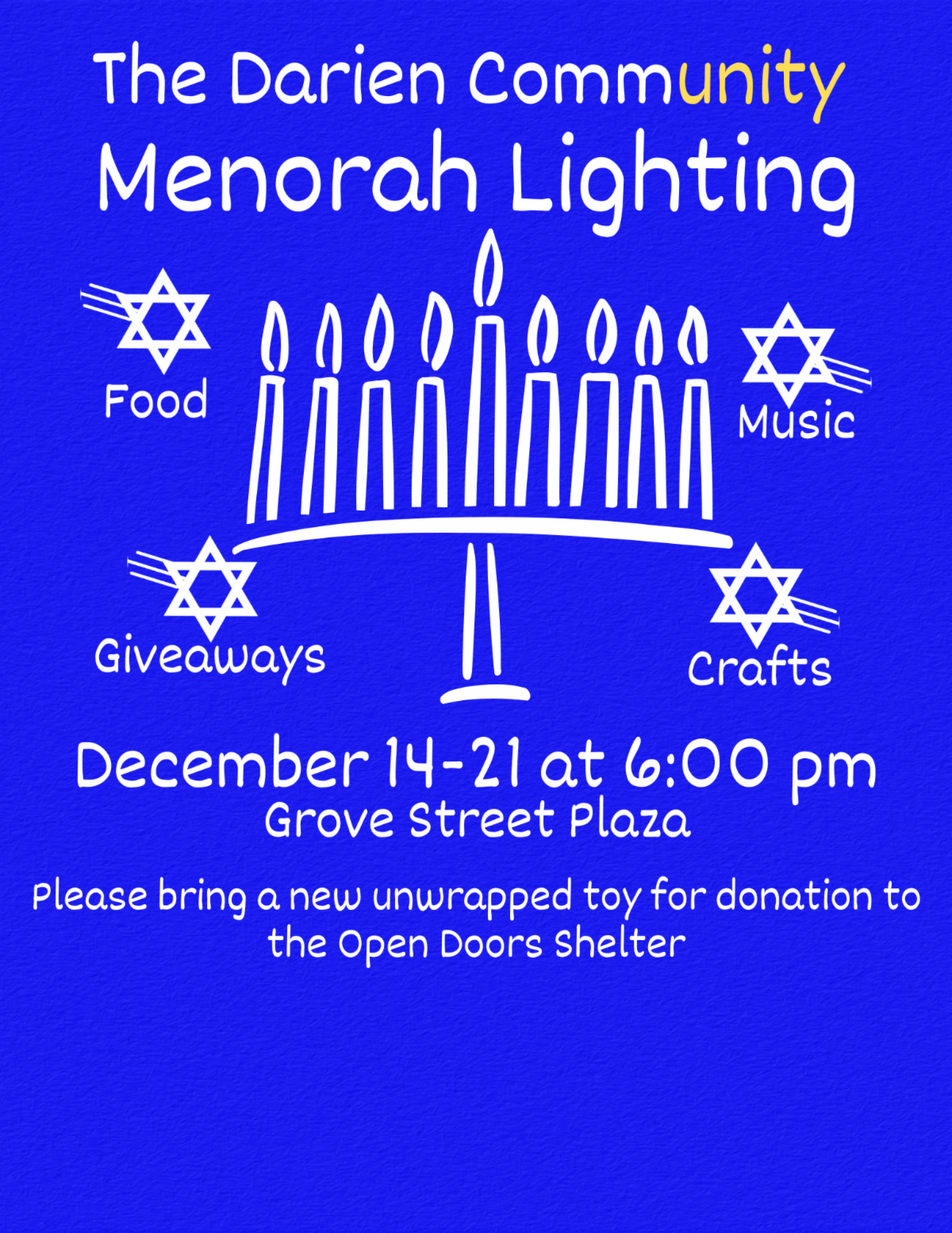 Congregation Shir Ami is once again honored to light the Darien community Menorah on Tuesday, 12/16/2025, at 6:00 PM at Grove Street Plaza. As you may know, in 2021 Dan Gullen spearheaded the campaign to have a community Menorah lighting in Darien and Jan Raymond made sure that Shir Ami was part of this joyous celebration the past several years. If you have attended in the past, you know that whatever the weather Rabbi David will bring his guitar, his music repertoire and his wacky Menorah hat and be the crowd-pleaser he always is, blending song, learning and fun for all in attendance. We thank our good friends Dan and Jan for inviting Shir Ami again and hope to see you there on Tuesday, 12/16/2025, at 6 pm at Grove Street Plaza. Please also bring an unwrapped toy to donate to Open Doors Shelter in Norwalk.