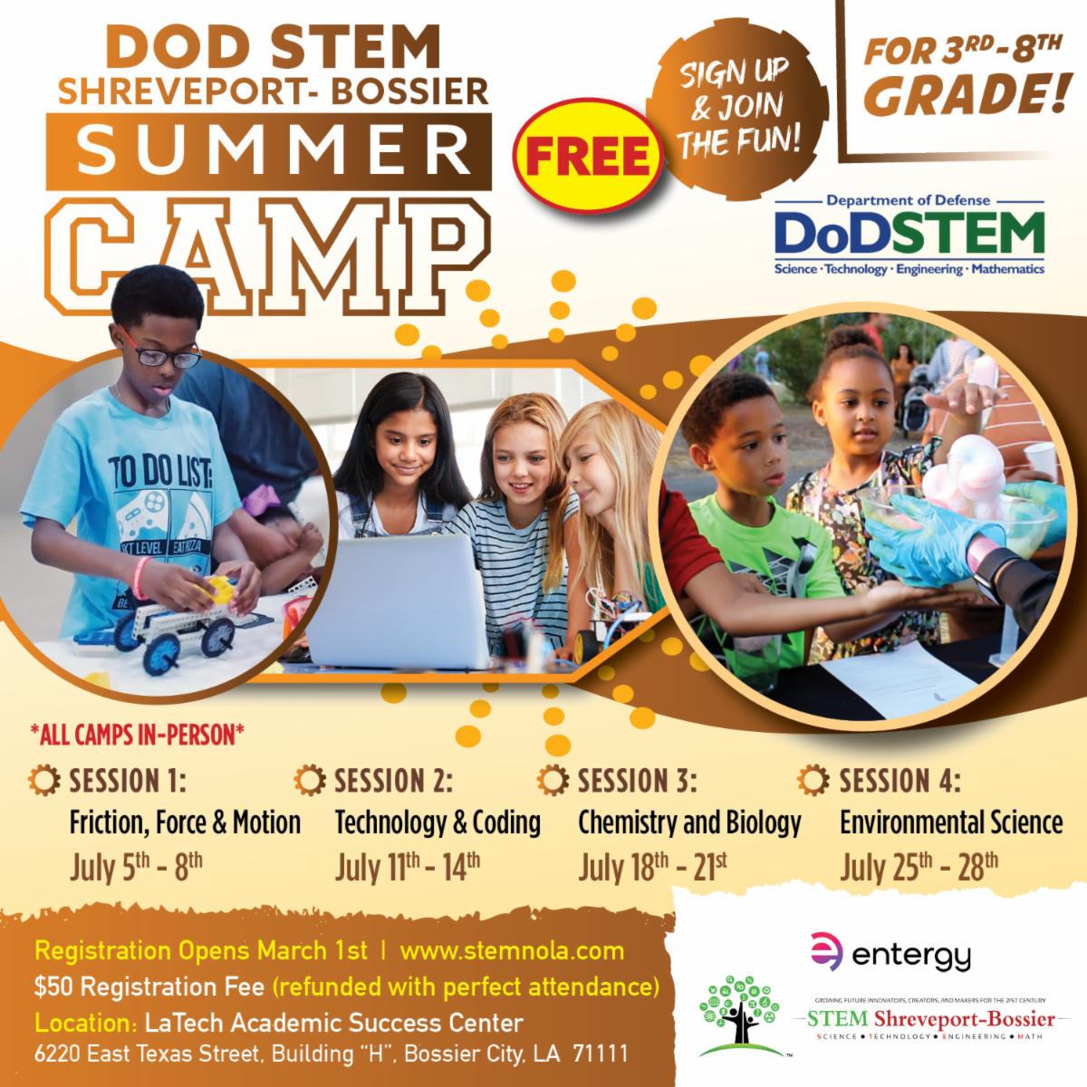DoD Shreveport-Bossier STEM Camp sessions are jam packed with activities. Each session is intended for participants in 3rd-8th grades and will consist of live step-by-step instructions to complete STEM activities.