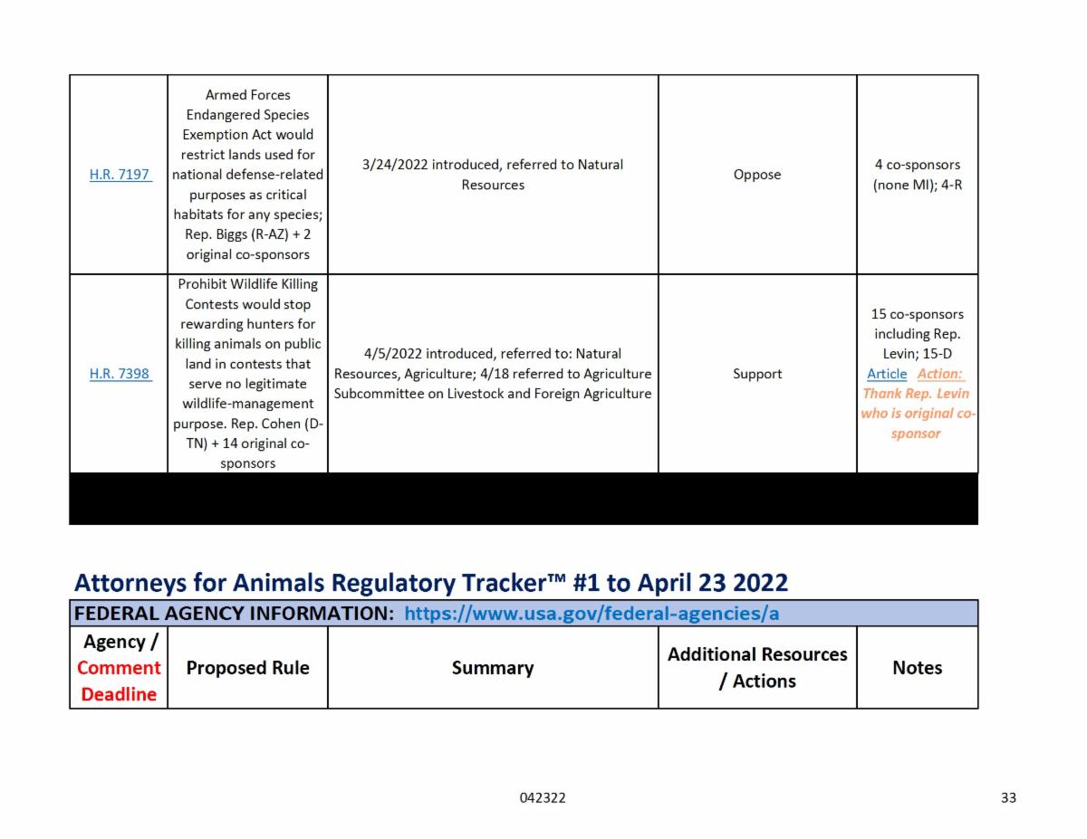 You can expect to see a list most months. Many of the items are opportunities to thank legislators (and others) for animal-friendly actions they've taken. Others are alerts to federal regulatory actions of note.